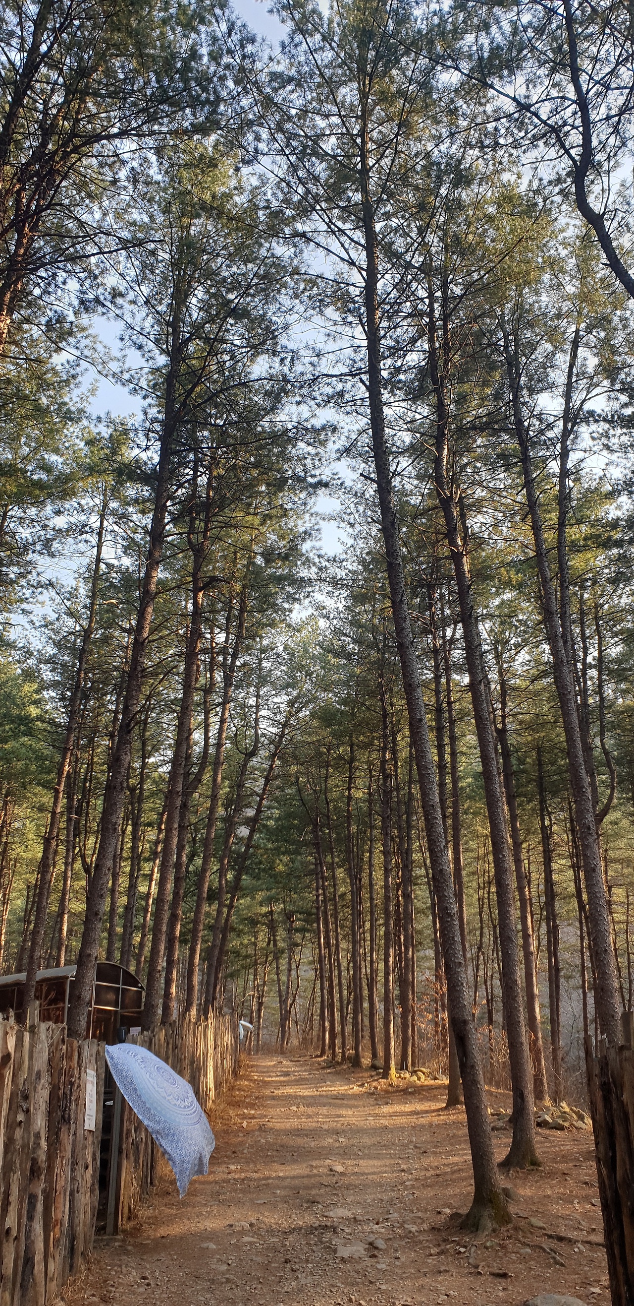 호명산 잣나무 숲속 캠핑장 입구 - 잣나무가 빽빽하다. (그리운 피톤치드)