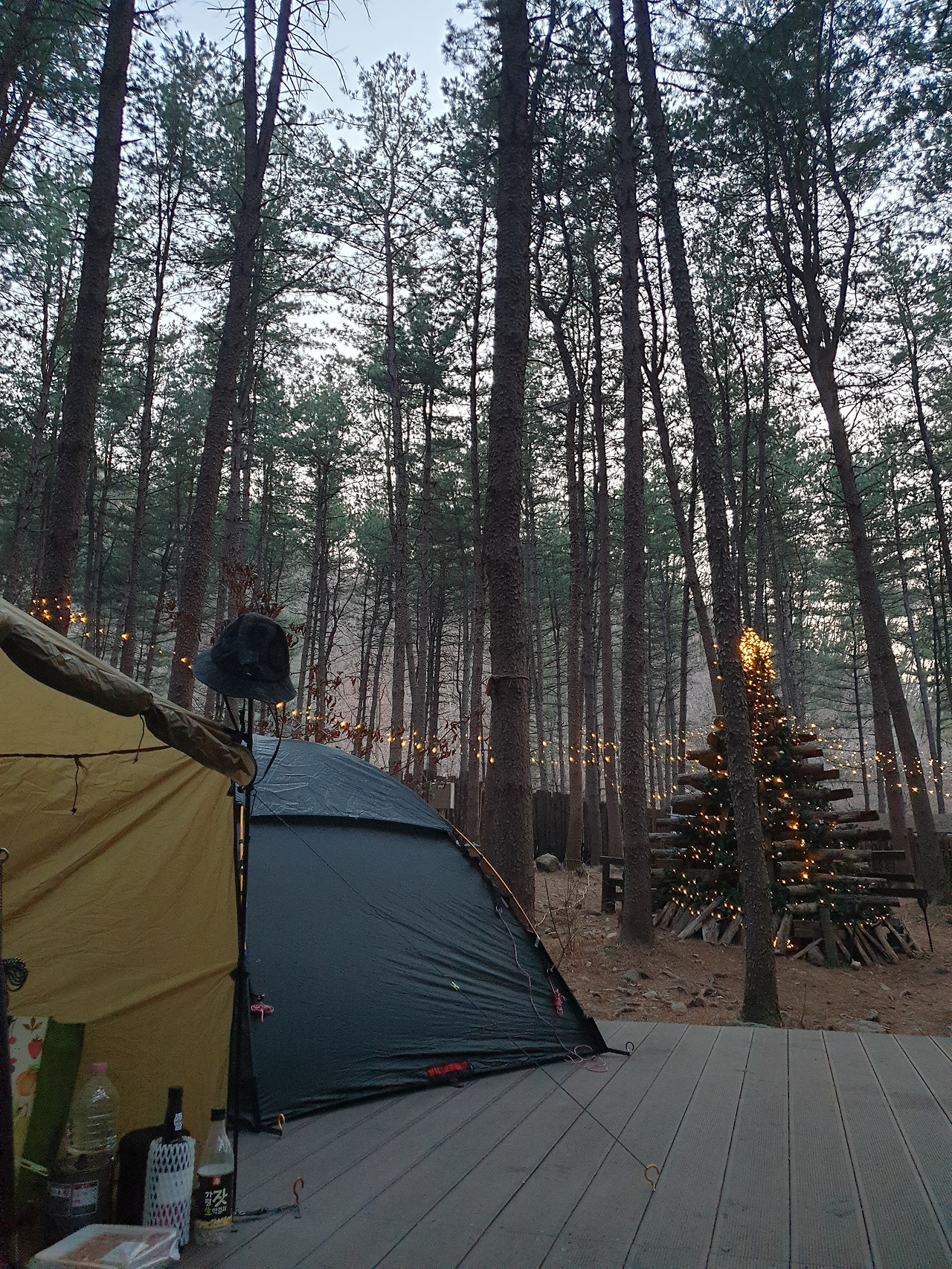 캠핑장 데크 위 텐트피칭을 마치고 나니, 호명산 잣나무 숲속캠핑장의 마스코트 잣나무 트리에 불이 켜졌다.