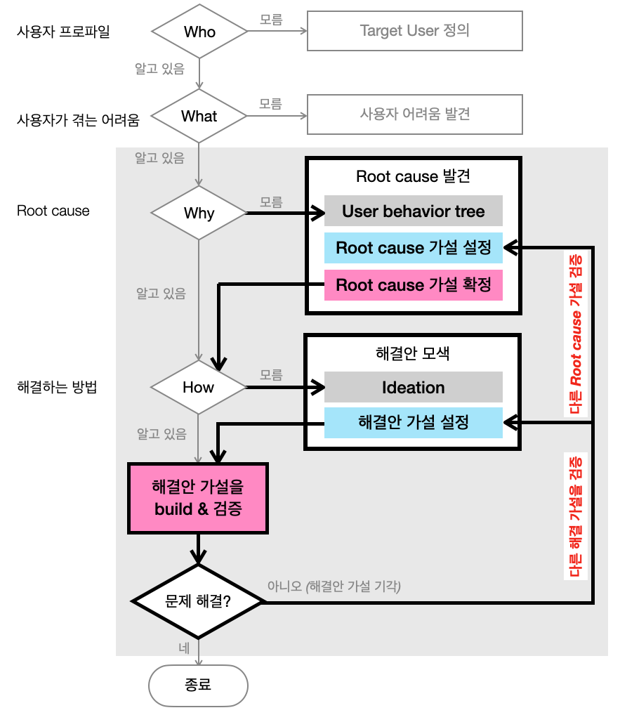 Solution 가설을 검증해 본 결과 가설이 기각될 경우, 다른 해결안을 테스트해 보거나 Root cause를 다시 살펴봅니다. 해당 가설로 사용자 문제가 해결되지 않았다면 이를 반복합니다. 그래도 사용자 문제가 해결되지 않았다면 더 앞으로 가서 우리가 사용자 어려움 자체를 잘못 파악한 것은 아닌지 검토합니다.