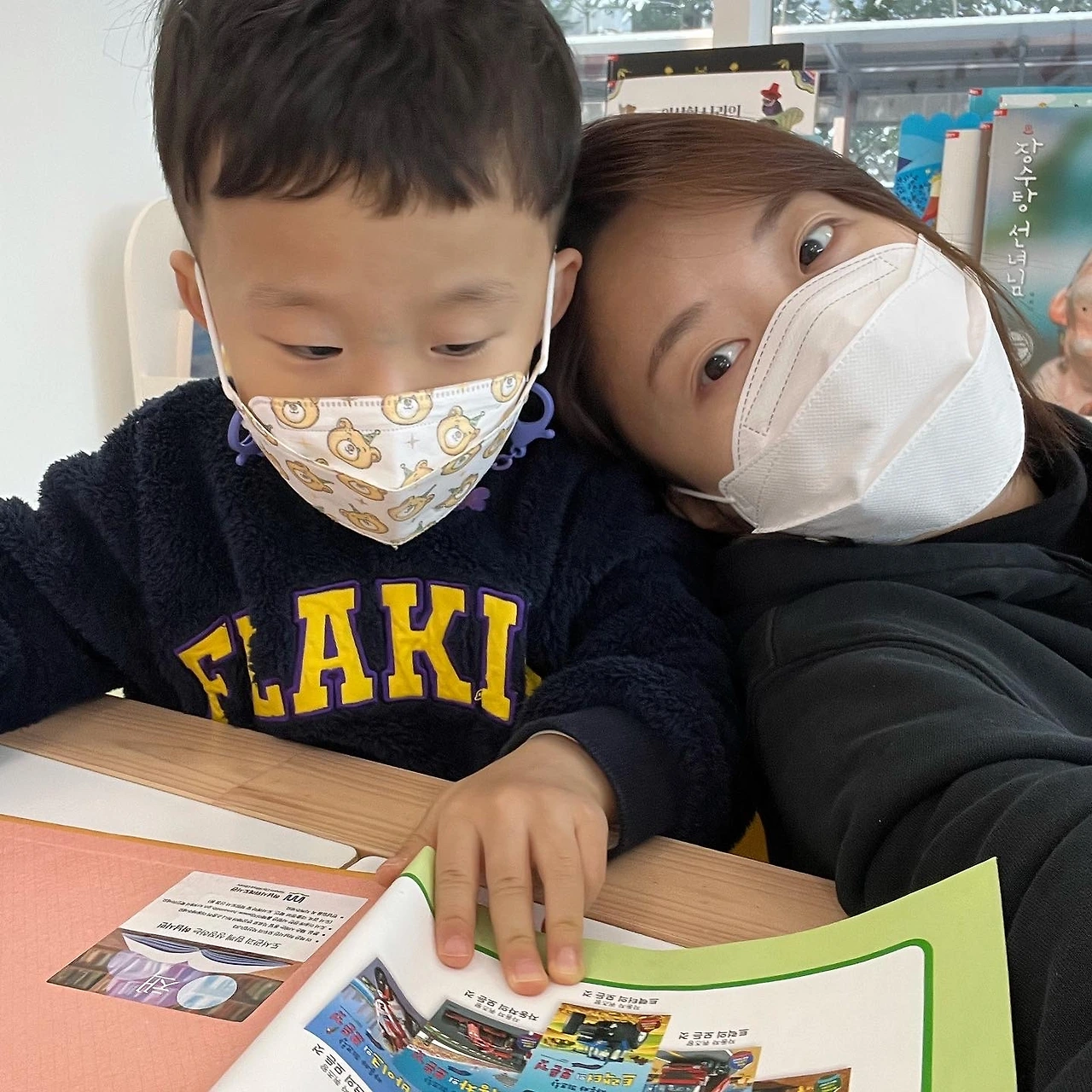 그리고 최근에 이런 엄마, 아빠의 노력을 알아차렸는지 조금씩 달라지는 게 느껴졌다. 홍시는 도서관에 오면 항상 엄마, 아빠한테 책을 읽어달라고 한다. 그러면 나와 정양은 작은 목소리로 홍시 옆에 앉아서 책을 읽어 주고는 했다. (도서관 어린이실은 책을 읽어줄 수 있는 공간이다.) 그런데 최근에 옆자리에서 혼자 의젓하게 앉아서 책을 읽는 형을 보더니 뭔가 좀 달라졌다. 홍시가 잠시나마 혼자 책상에 앉아서 책을 보고 있었다. 아직 글씨는 모르지만 책 속의 그림들을 보면서 이것저것 생각하는 것 같았다.