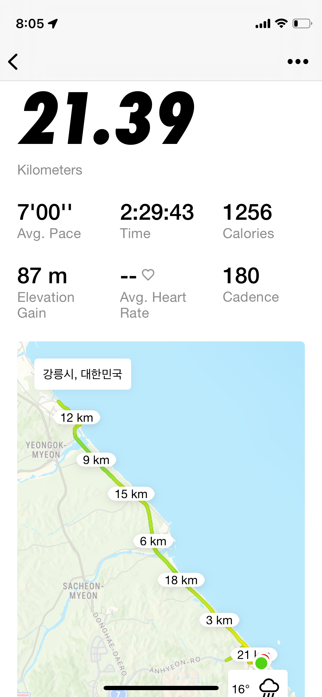 아직 완급조절은 못한다. 그래서 이번에도 중간에 오버페이스가 될까 봐 7:00으로 쭉 달렸다. 21km에 대한 거리감이 체감이 안되니 페이스를 올릴 수가 없었다. 처음 약속한 15km까지는 별 감정이 없다가 17km네서 울컥했다. 폭우가 내려서 그게 눈물인지는 모르겠는데 그동안 포기 안 한 내가 참 좋았다. 짧지만 굵었던 연습시간들이 지나갔고 아쉬움도 없었다. 기록단축은 앞으로 계속 뛰면서 1년에 백몇 개씩 있는 마라톤 대회 아무거나 나가도 되니깐 상관없었다. 자기 자신이 마음에 들기 쉽지 않은 현대사회에서 오늘 하루만큼은 그 모습이 너무 예쁘고 대견했다.