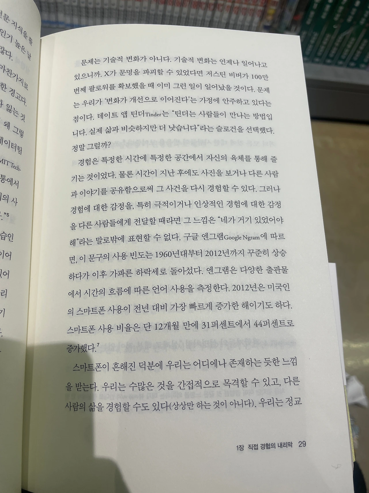 "경험은 특정한 시간에 특정한 공간에서 자신의 육체를 통해 즐기는 것이었다. 물론 시간이 지난 후에도 사진을 보거나 다른 사람과 이야기를 공유함으로써 그 사건을 다시 경험 할 수 있다. 그러나 경험에 대한 감정을, 특히 극적이거나 인상적인 경험에 대한 감정을 다른 사람들에게 전달할 때라면 그 느낌은 "네가 거기 있었어야 해"라는 말로밖에 표현할 수 없다. 스마트폰이 흔해진 덕분에 우리는 어디에나 존재하는 듯한 느낌을 받는다. 우리는 수많은 것을 간접적으로 목격할 수 잇고 다른 사람의 삶을 경험할수도 있다."