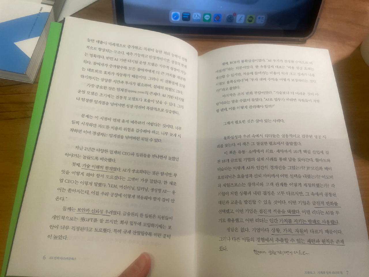 결국 이 책에서 말하고자 하는 것은 우리가 마주한 현실 이 지점이 기술의 선택이 아니라 존재의 선택이며, 리더가 기계에게 무엇을 맡기는가의 문제는 곧 인간으로서 우리가 무엇을 지키고자 하는가에 대한 근본적인 상황을 말한다. 이 책의 타깃독자가 리더인 점을 보았을 때 회사를 운영하는 관점에서 책을 마주하면 좀 더 도움이 될 것 같다는 생각이 들었고, 현재 회사를 운영하는 것이 아니라면 개인 삶의 운영 관점으로 필요한 요소들을 골랐으면 된다고 느꼈다. 이 책에서 말하듯이 기업마다 상황, 가치, 자원이 다르지만 경험에서 추출할 수 있는 패턴과 원칙이 존재한다가 답인 듯하다. 그처럼 인간도 각자가 가지고 있는 상황, 가치, 자원이 전부 다르다. 그렇기에 다른 사람의 경험에서 추출할 수 있는 패턴과 원칙을 찾아내는 것이 중요하다. 그리고 그 경험은 소중하다. 꽤나 긴 내용이었지만 사례중심이어서 훌훌 넘겨 읽었다. 모임에서 더 깊은 이야기를 나눴으면 한다.
