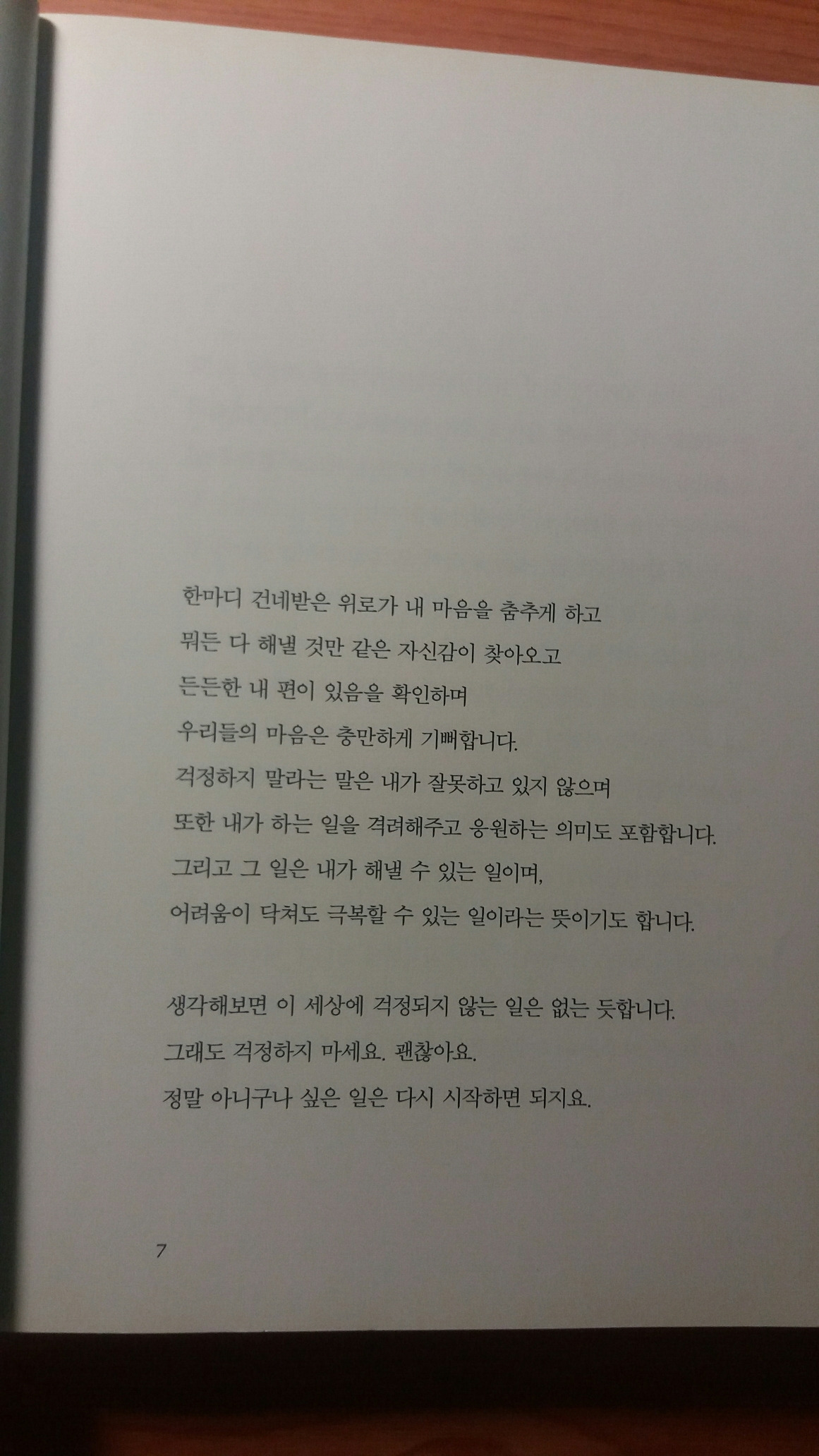 제목을 보자마자 눈물이 핑 돌았다. 우리는 스스로에 대한 채찍질에는 익숙하지만, 작지만 따스하게 감싸는 나에 대한 응원에는 낯간지러워한다. 아마도 ‘나를 위로해 주는 이야기가 필요했다’라는 것을 외면했는지도 모른다. 힘들어도 버텨야 하는 줄 알았던 지친 내 영혼을 돌아본 적이 있는가?