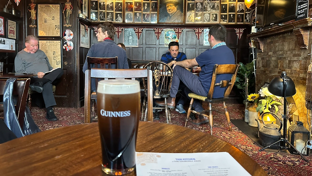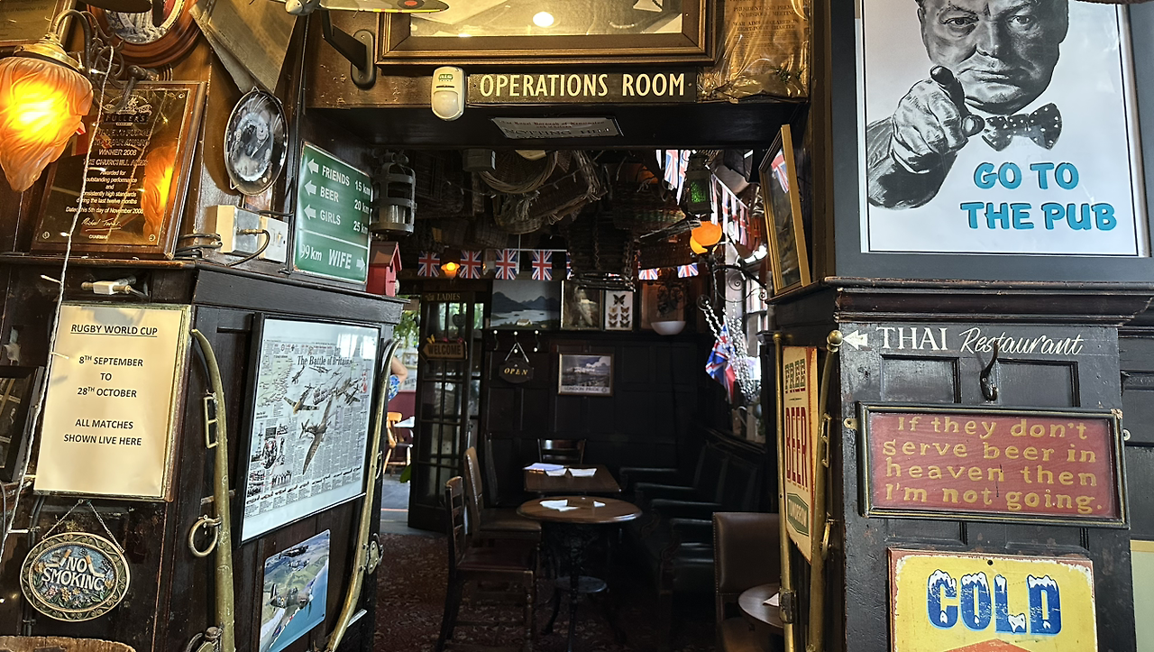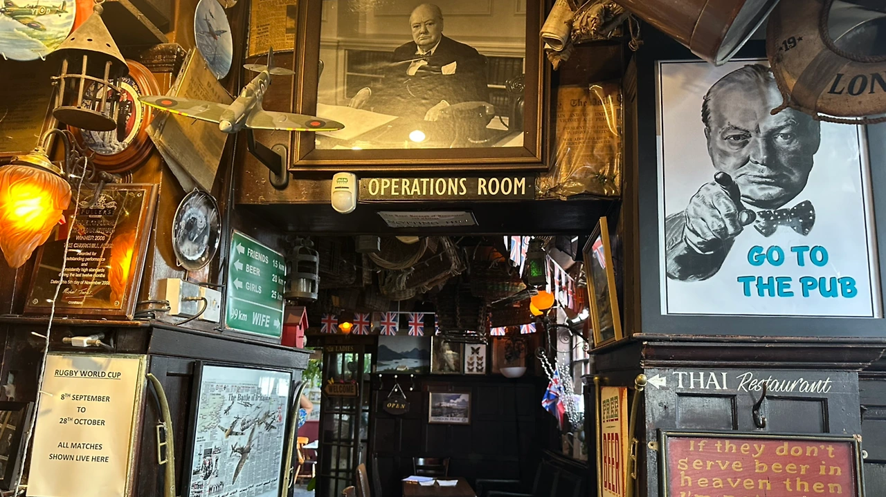 그 당시 총리였던 윈스터 처칠은 영국 전쟁영웅이다. "우리에겐 항복이 있을 수 없다. 바다, 섬, 해변, 하늘, 길거리, 벌판 등 그 어느 곳에서라도, 그 희생이 얼마가 되더라도 흔들르지 않는 믿음을 갖고 끝까지 싸우겠다"라고 천명했던 연설은 아주 유명하다. 2차 세계대전을 승리로 이끈 주역으로 많은 영국인들에게는 우리나라 이순신 장군 이상으로 사랑받는 사람이다.(이순신 장군 같은 위대한 영웅과 비교하기 부족하겠지만 영국인들의 사랑은 그 이상이다) 펍을 들어서는 순간부터 처칠 박물관인가 싶을 정도로 사진과 흔적들로 도배되어 있다.
