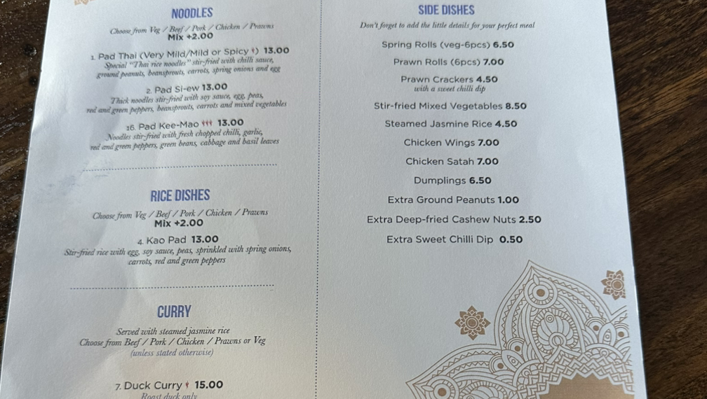 타이 음식들이 주 메뉴다. 대체적으로 음식들이 다 맛있다는 평들이 많다. 카오팟과 새우 롤을 주문했다.