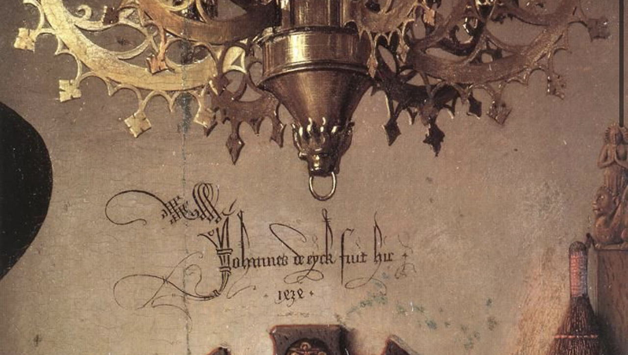 하지만 그림을 또다시 자세히 들여다보면 '1434년 얀반 아이크 이곳에 머무르다'라고 쓰여있다. 1447년 아르놀피니 부부가 결혼한 기록이 있다. 즉 동명이인이다.