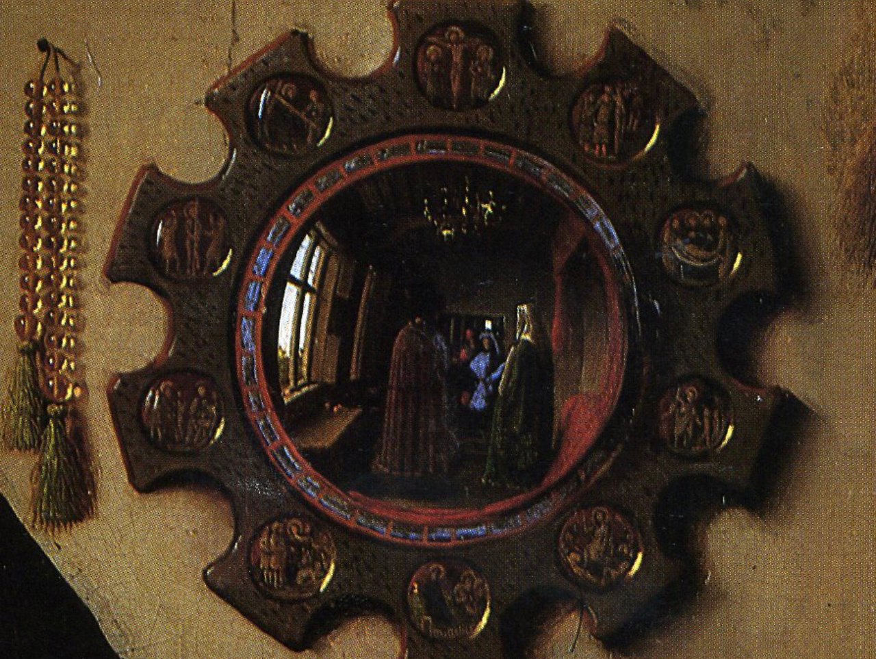 거울 속을 자세히 들여다보면 얀 반 아이크뿐 아니라 다른 이도 보인다. 결혼 서약의 증인으로 추정된다.
