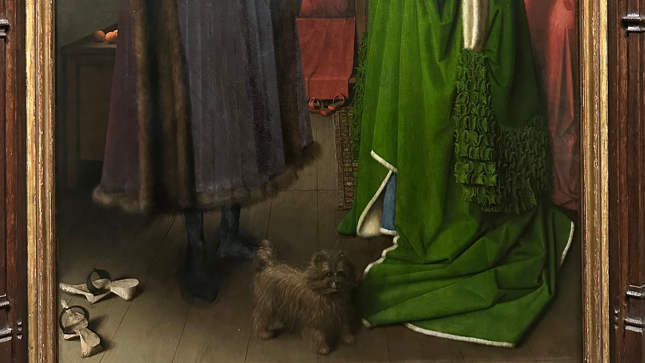 그리고 두 사람 사이에 한 마리의 개가 정면을 향해 서 있다. 개는 충실과 헌신, 사랑의 상징적인 의미를 담고 있다. 이것을 여성에게 강요하고 있다. 기독교였던 이 당시에는 모든 원죄를 지은 사람은 여자였기 때문이다. 그래서 원죄를 상징했던 사과가 창가 위에 놓여있다.