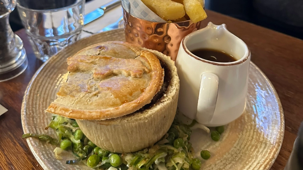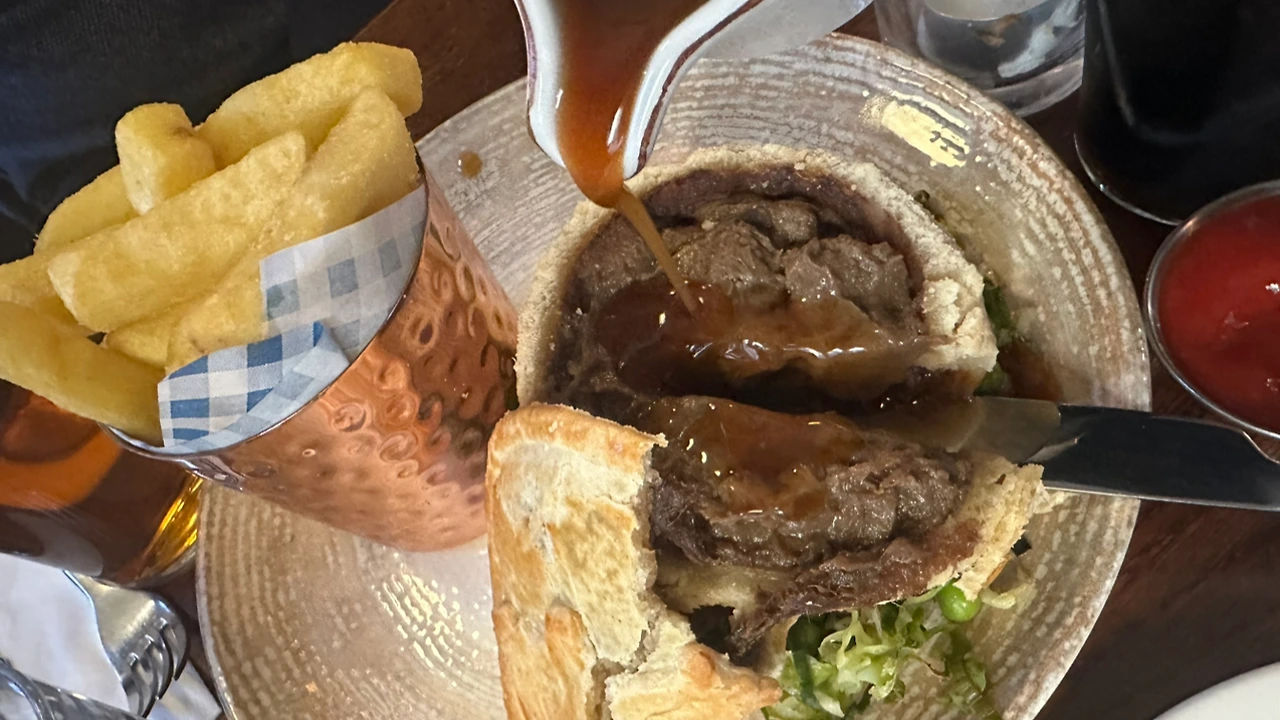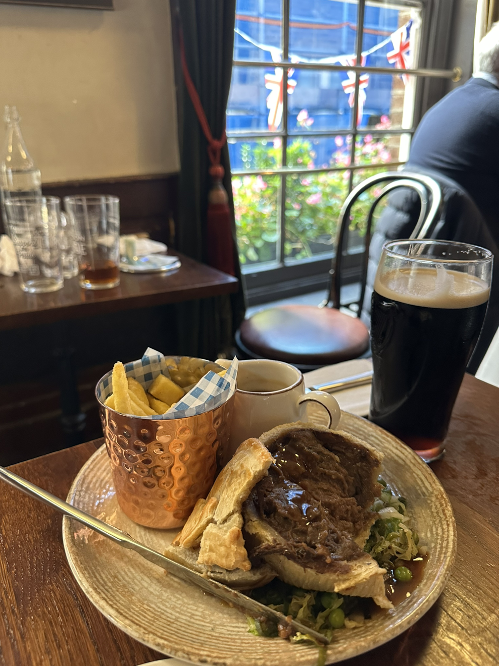 드디어 주문한 영국 대표 전통음식 에일파이가 나왔다. 이름에도 알 수 있듯 영국 전통 에일 맥주가 음식 재료 중 하나이다. 그리고 겉바속촉이다. 겉은 바삭한 파이에 속은 촉촉한 깊고 진한 맛의 쇠고기 스튜.
