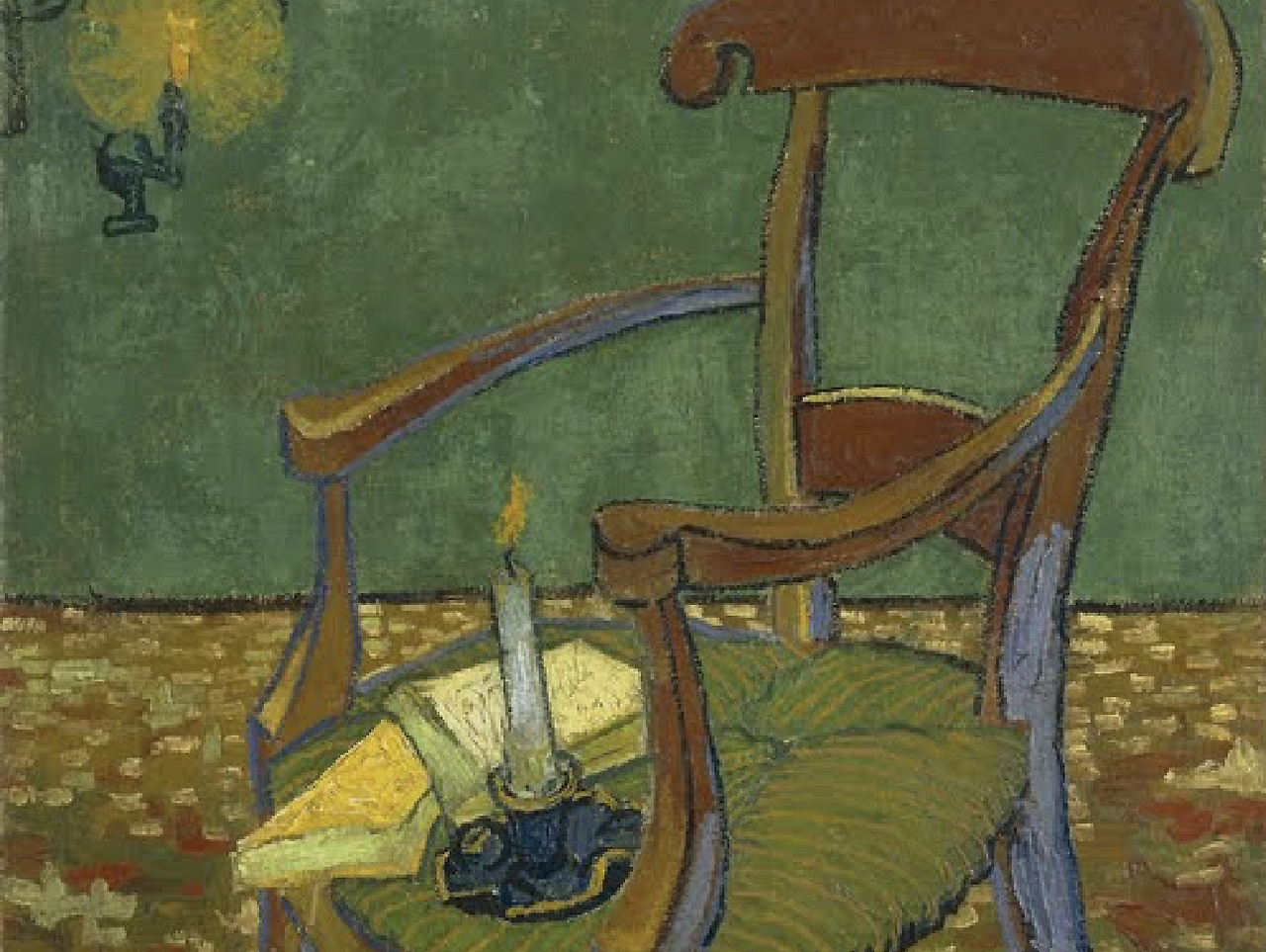 뒷 배경의 파란색은 고흐의 차가운 마음을 나타낸다. 저렴해 보이는 이 초라한 의자 위에는 담배 파이프를 놓았다. 고흐 자화상에 자주 등장하는 담배파이프가 고흐의 유일한 친구 같다. 외롭다는 표현을 담배파이프로 대신했다.