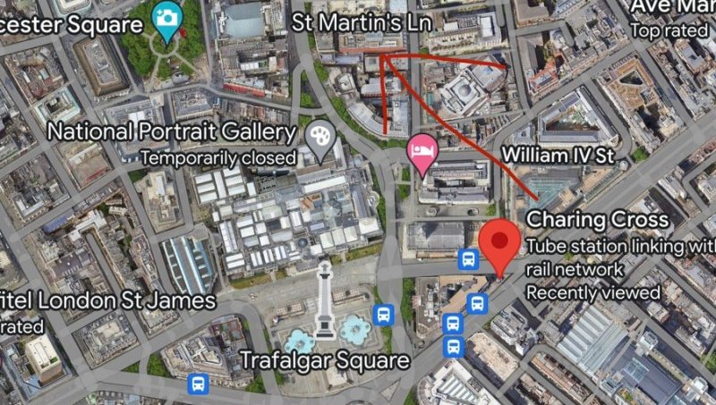 채링크로스 역 부근을 지나 내셔널 갤러리가 있는 트라팔가 광장과 세인트 마틴교회를 지나간다.