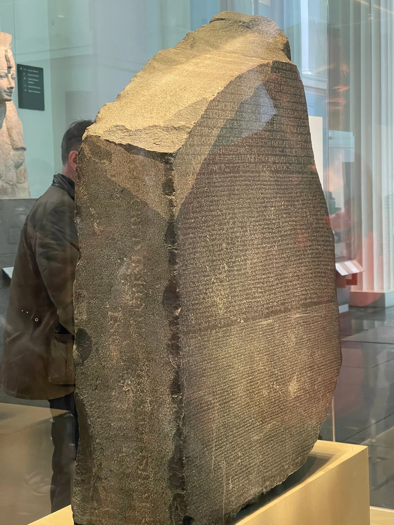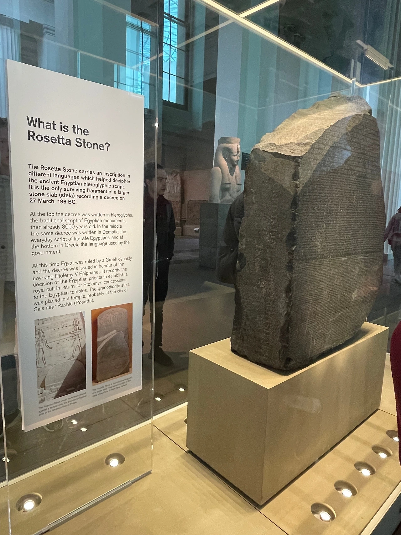 기원전 196년 프톨레마이오스 왕이 사제들에게 큰 은혜를 베푼 것을 찬양한다는 내용이 새겨져 있는 로제타 석은 대영 박물관에서 꼭 봐야 하는 유물이다. 그리스어를 바탕으로 어려웠던 이집트 상형 문자 해석이 가능해졌다고 한다. 인류 초기 이집트 문명에 대해 이해해 보는 시간을 갖게 해 준 유물.