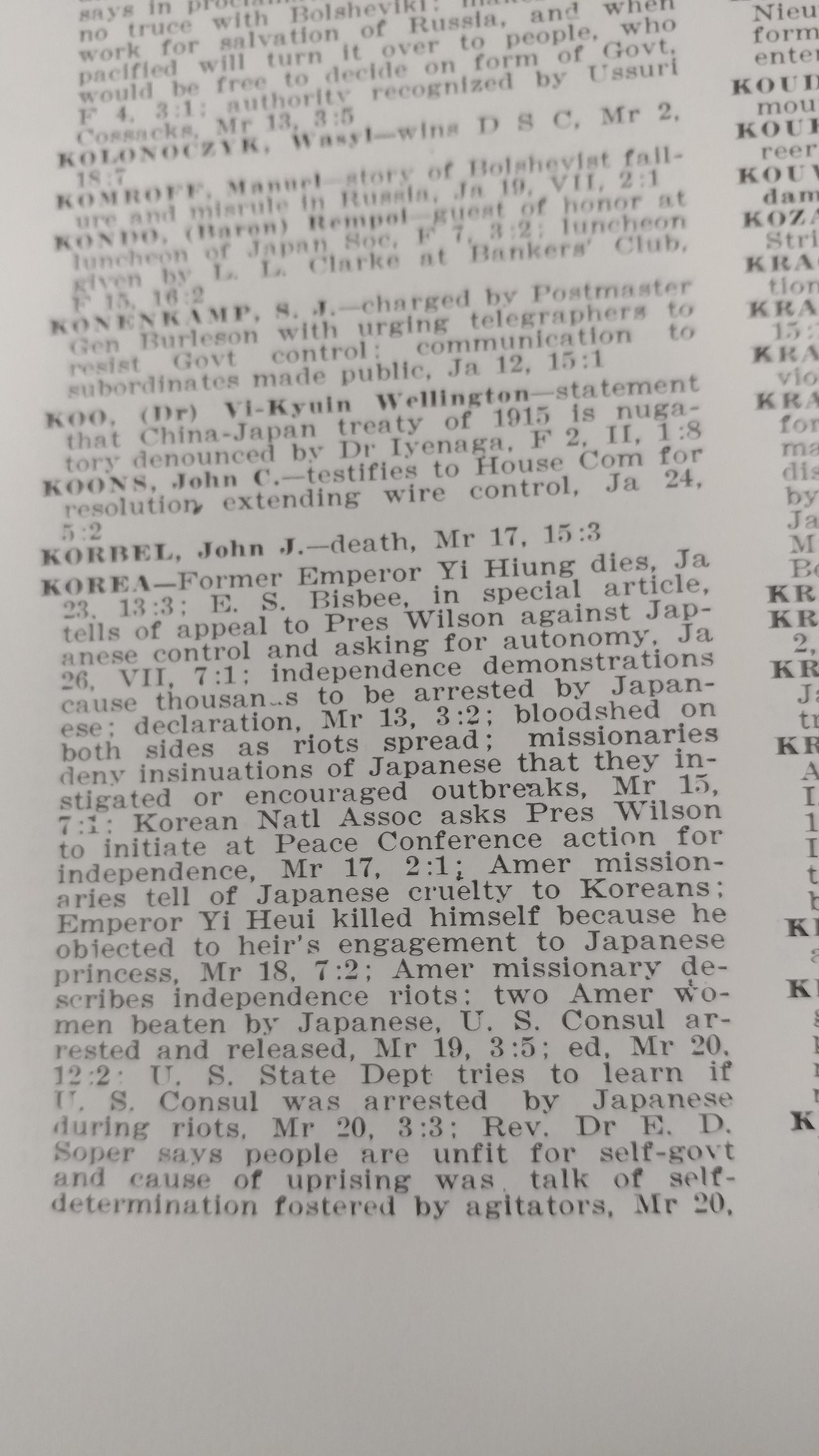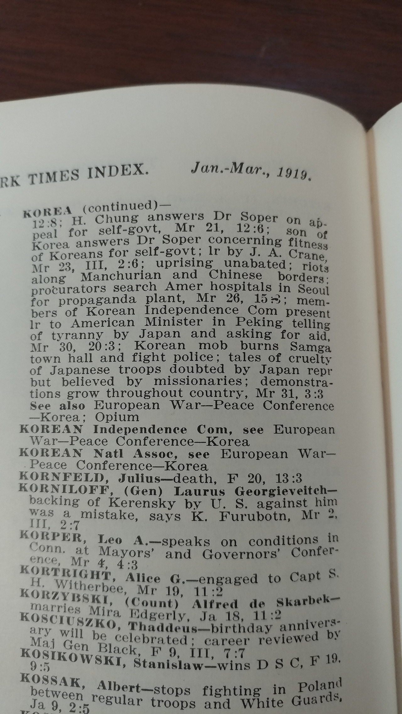 미국의 법률이 만들어지는 의회, 그 광범위한 자료 수집과정에서 여기 있는 수 백만권의 책들이 정책에 관계할 것이다. 그 더미들속에서 뉴욕타임스 인덱스 모음을 찾아냈다. 1851년 최초 발행 이후 지금까지의 기사들의 제목을 묶어 놓은 낡은 서적이 도서관 북쪽 2층 한편을 빼곡히 차지하고 있었다. 현대사 중요 사건들에게 대한 미국의 시각을 기록한 사료로서 가치가 있는 자료였다. 그렇다면 3.1 운동에 대한 기록도 있지 않을까 호기심이 생겼다. 1차 대전 한가운데서 제국주의 세력 중 하나인 일본에 강제 병합된 한반도민 106만 명이 저항에 동참한 그 운동에 대한 미국 언론의 시각이 궁금해졌다. 서가에 꽂힌 수십 권의 단행본 중 1919년 1월-3월 사이 3.1 운동 전후한 시기에 KOREA란 이름으로 검색해 보았다.