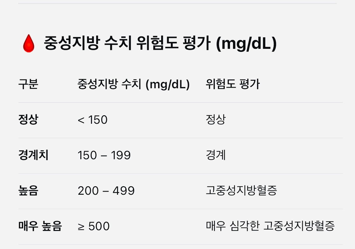 하지만 결과는 달랐다. 수치로 보여지는 내 몸의 상태는, 내 생각과 너무도 달랐다. 그제야 깨달았다. 겉으로 드러나는 것만으로는 결코 내 몸을 온전히 알 수 없다는 사실을. 그리고 그 착각이, 내 삶의 리듬까지도 어긋나게 하고 있었음을. 중성지방 수치에 대한 감이 없었던터라 ChatGPT한테 물어봤다.