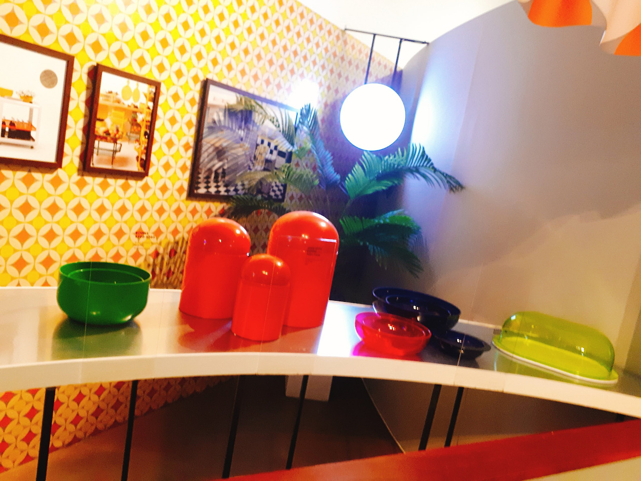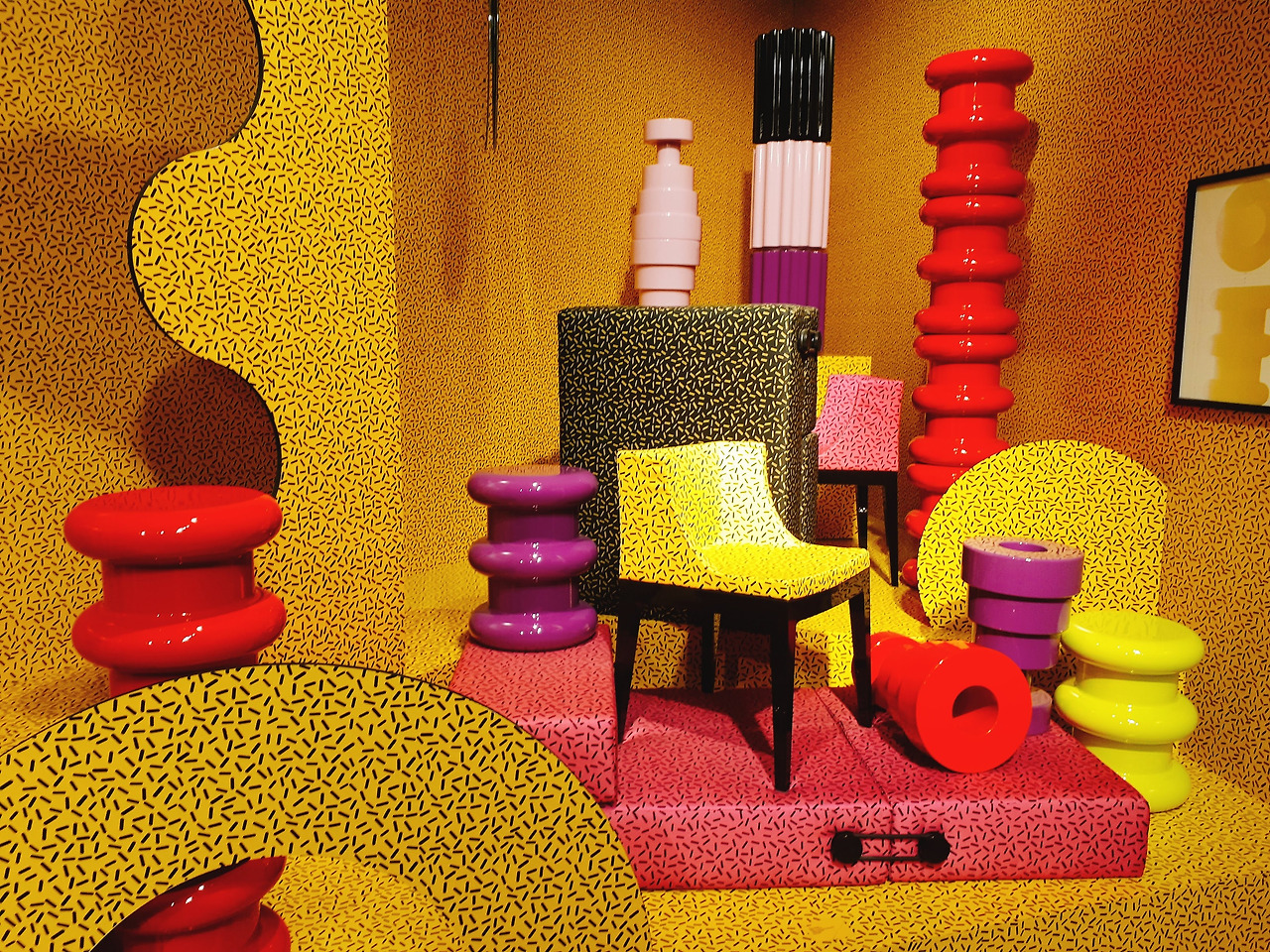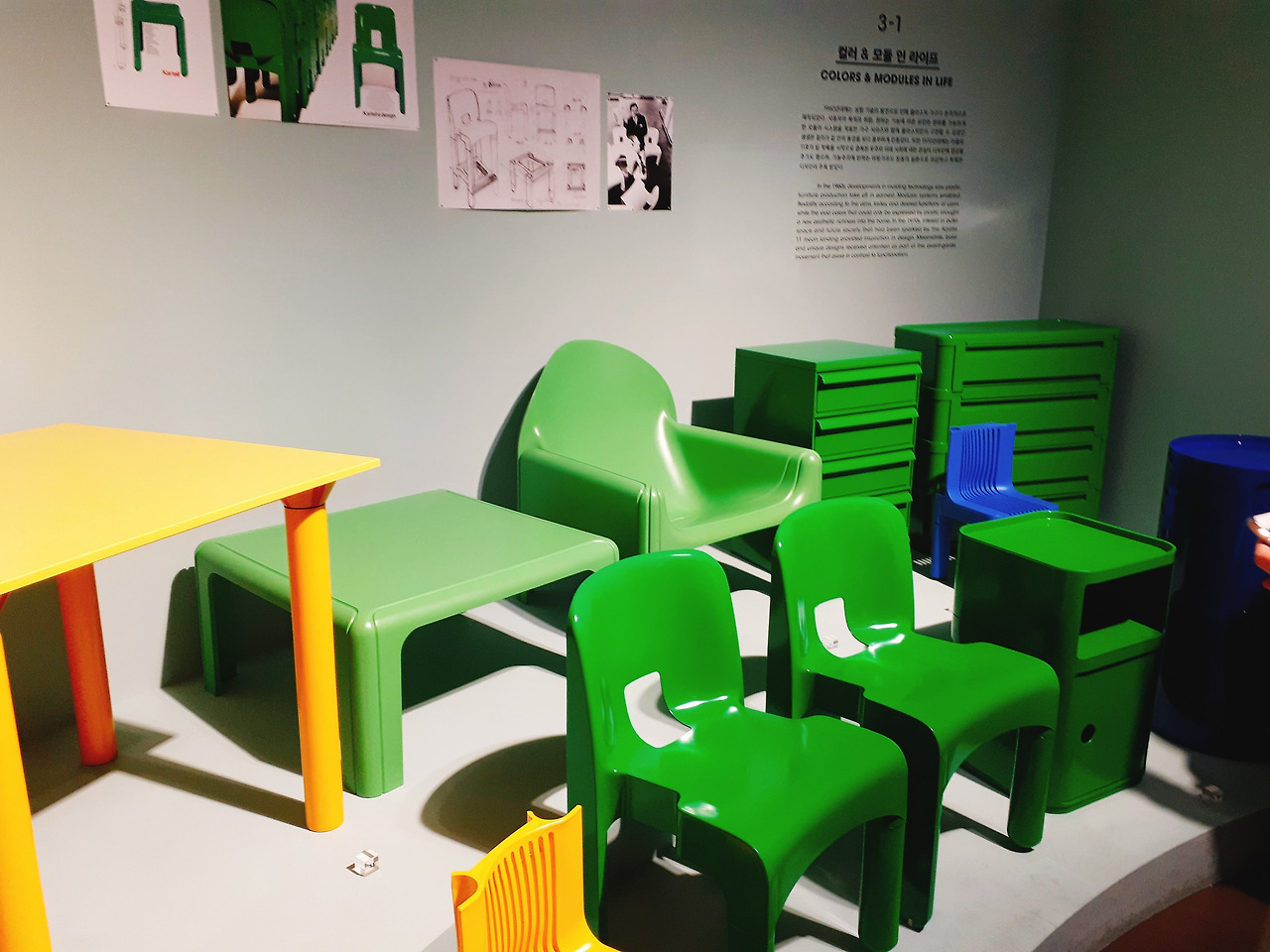 마치 파티 장의 샹들리에를 보는 듯한 느낌의 플라스틱 작품을 보고 2층에 올라오면 좀 존에 봤던 화려함과는 또 다른 화려함에 반하게 된다. 바로 비비드 한 컬러의 플라스틱 때문이다. 설명에 따르면 기존의 플라스틱은 화려함보다는 실용적인 것에 더 초점을 맞추고 있었다고 한다. 하지만 어는 순간 예술 작품은 실용성보다는 예쁜 게 우선이라는 의견이 나오면서 만들게 된 작품들이라고 한다. 그래서 이 작품들은 포스트 모더니즘에 속하는 작품이라 할 수 있다.