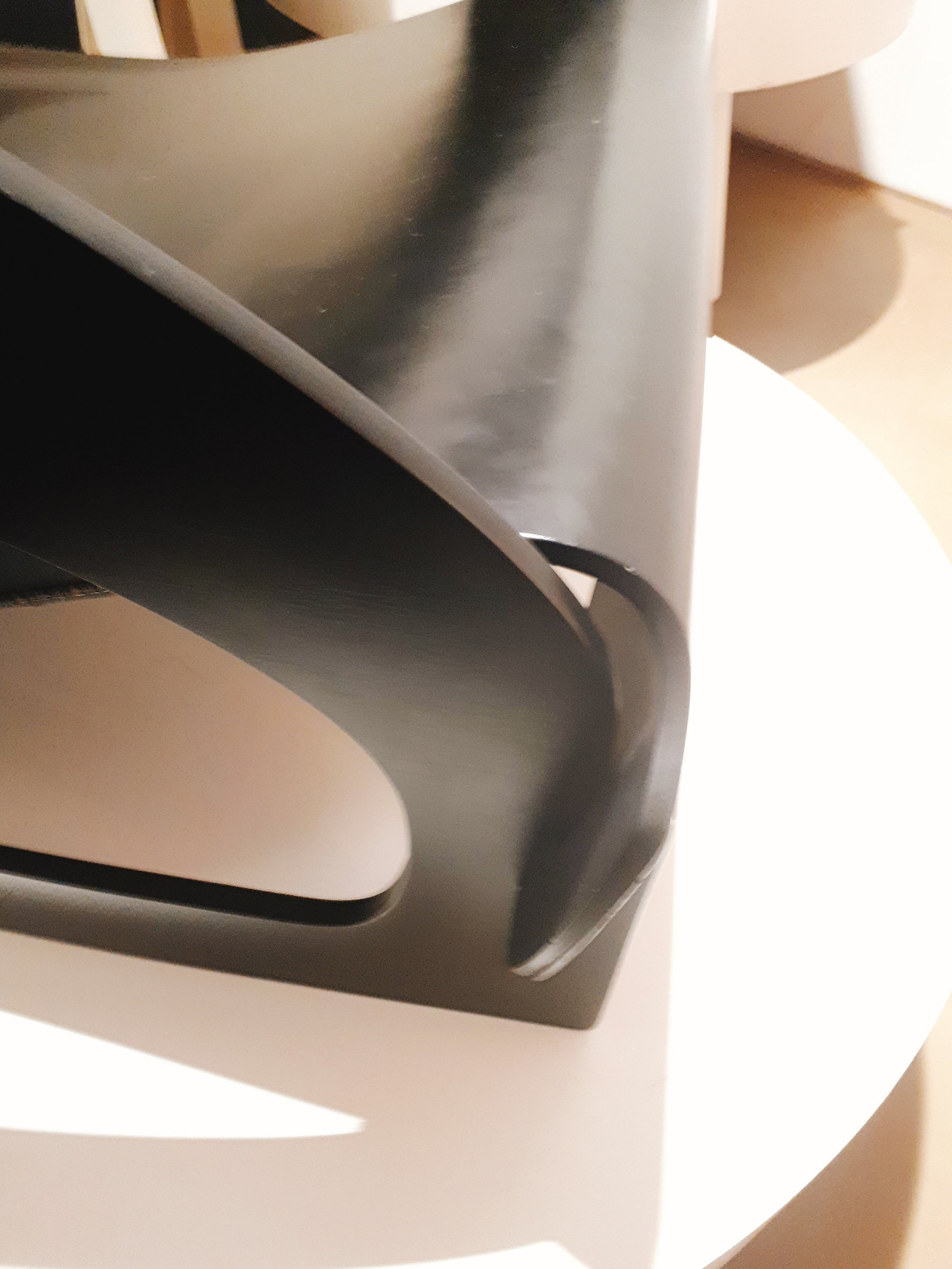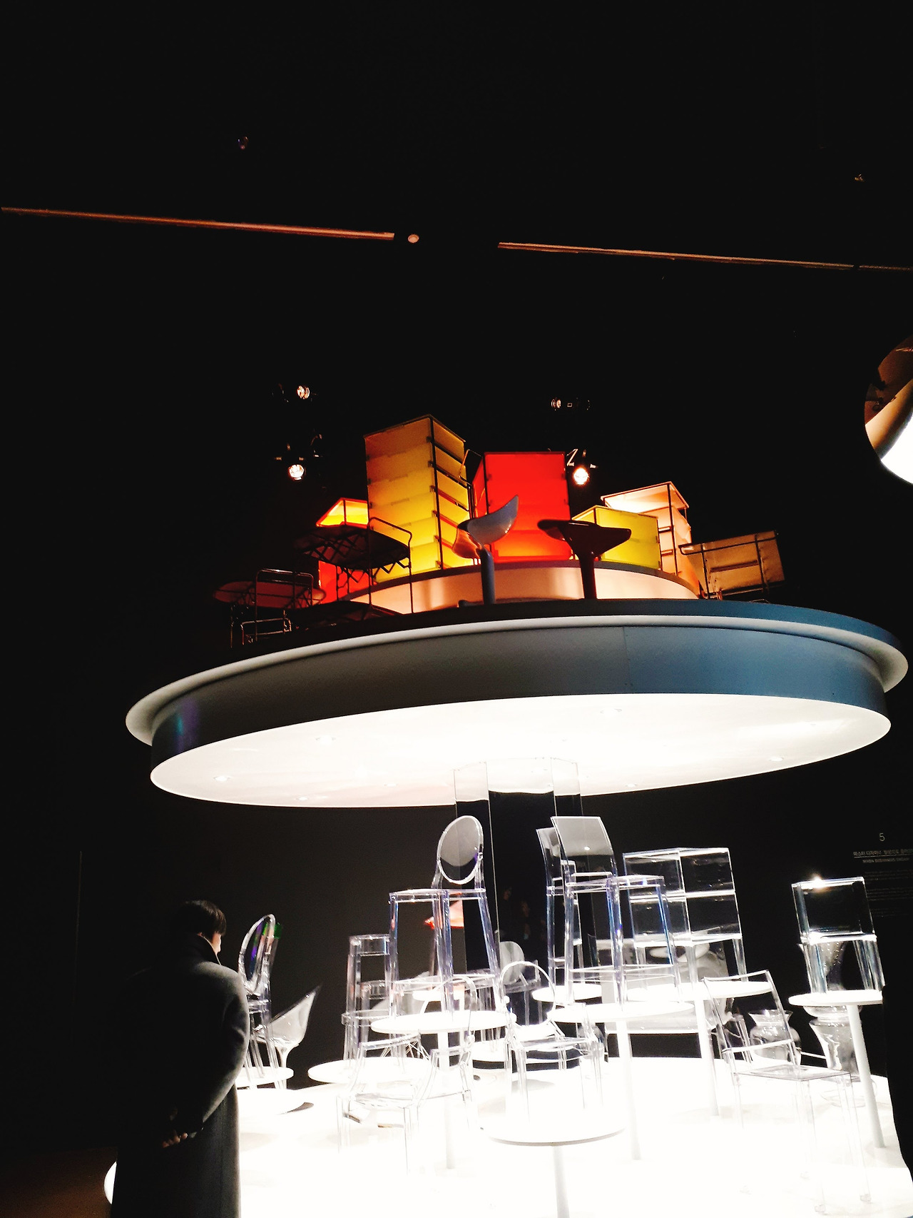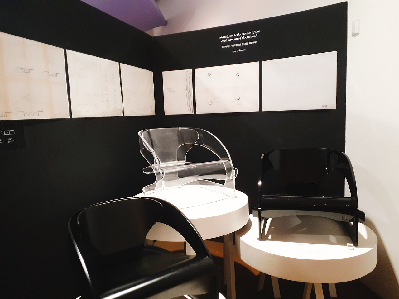 이번 전시를 하면서 가장 마음에 들었던 공간을 꼽으라면 이 곳이 아닐까 한다. 놀이공원의 회전목마처럼 생긴 디스플레이 장소에 작품들이 올라가 있다. 위에는 접고 필수 있는 형태의 실용적인 플라스틱 작품이 있고, 아래에는 전시장에 처음 들어올 때 봤던 투명한 의자 종류가 있다. 플라스틱이 가진 화려함을 받치는 것은 그것이 가진 투명하고 순수한 성질이라는 느낌을 주는 작품이었다.