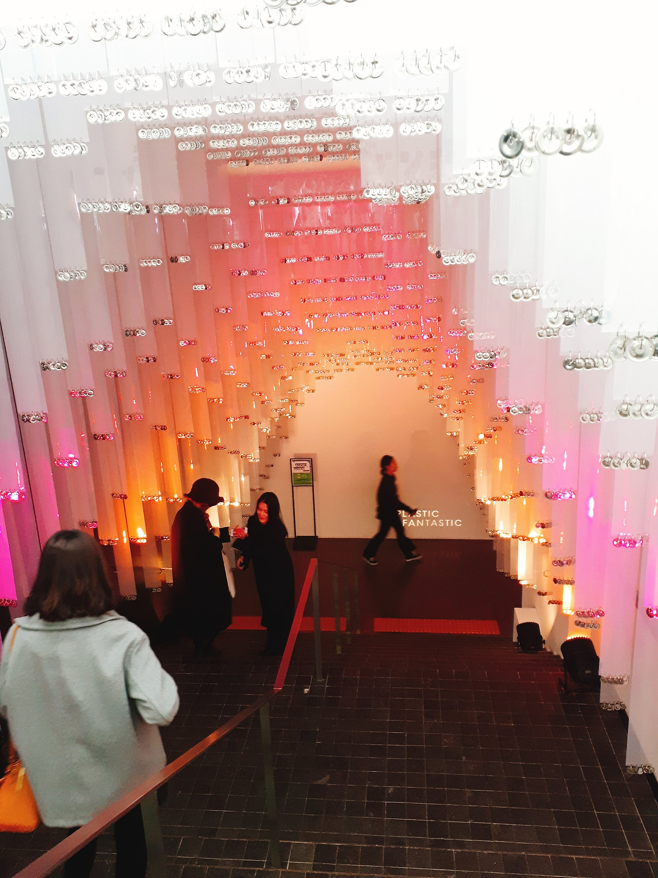 아치형의 플라스틱 장식이 있는 줄과 아닌 줄. 두 곳에 서서 교차로 입장했다. 플라스틱 장식 너머로 보이는 전시 플래카드가 화려해 보였다. 마치 엘리스가 이상한 나라로 들어가는 듯한 느낌이 든다. 플라스틱이 주는 아름다움은 전시장을 들어서고 나서도 이어졌다. 지하로 연결되는 계단 위로 하얀색의 샹들리에 같은 조형이 입구의 조형과 대비를 이루며 전혀 다른 분위기를 연출했다. 마치 신부가 되어 천천히 미지에 세계로 들어가는 느낌.