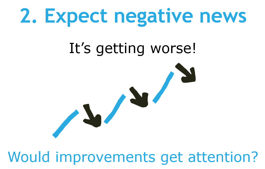 한스 로슬링은 역시나 이러한 반론을 예상한 것 같다. 그는 사실충실성에 의거해 부정 본능을 억제하는 방안을 제시한다. 그가 제시한 데이터와 그것에 기반한 주장에 따르면 대부분의 사람들이 세계가 점점 나빠진다고 여기는 것은 ‘느낌’이지 ‘생각’이 아니다. 언론은 부정적인 이슈를 선별적으로 보도하고 있고, 나쁜 소식은 좋은 소식보다 전달될 확률이 훨씬 높으며, 점진적 개선은 뉴스가 되지 않는다. 때문에 우리가 접하는 자극적인 소식들로 인해 혼동하지 말 것을, 오히려 고통을 감시하는 능력이 좋아졌기 때문일 수 있다는 것을 염두에 두라고 조언한다. 이에 덧대 사람들은 유년의 경험을, 국가는 자국 역사를 곧잘 미화하기 때문에 장밋빛 과거를 조심할 것을 추가로 언급한다.