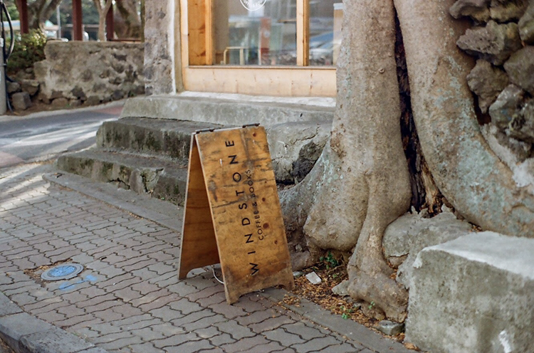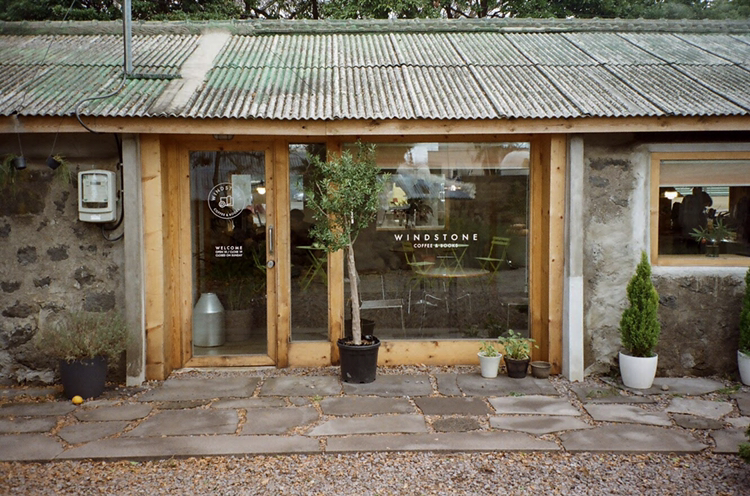 애월읍 중에서도 조용한 마을에 자리 잡고 있는 윈드스톤은 낮은 기와집을 리모델링해서 만든 공간이다. 입구에 위치한 큰 나무가 공간을 한층 더 풍성하게 만들어주고 있다.