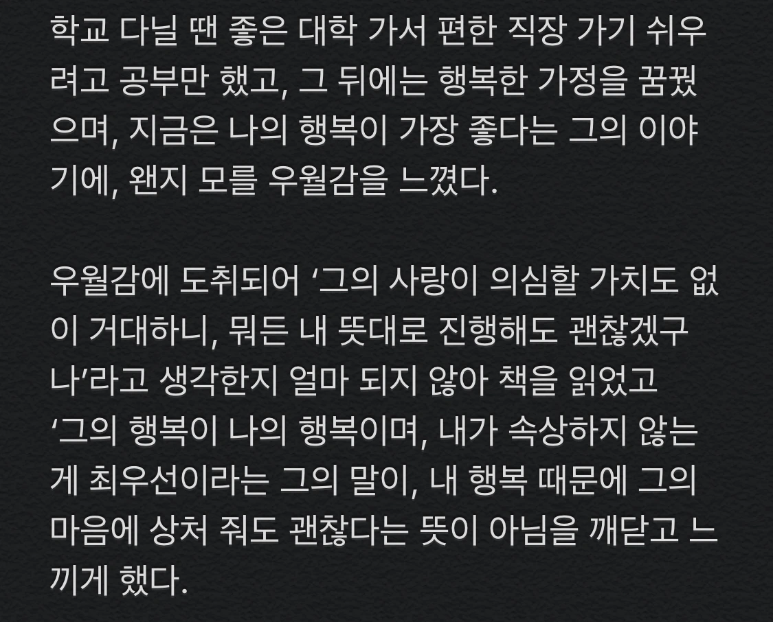 ‘그의 행복이 나의 행복이며, 내가 속상하지 않는 게 최우선이라는 그의 말이, 내 행복 때문에 그의 마음에 상처 줘도 괜찮다는 뜻이 아님을 깨닫고 느끼게 했다.