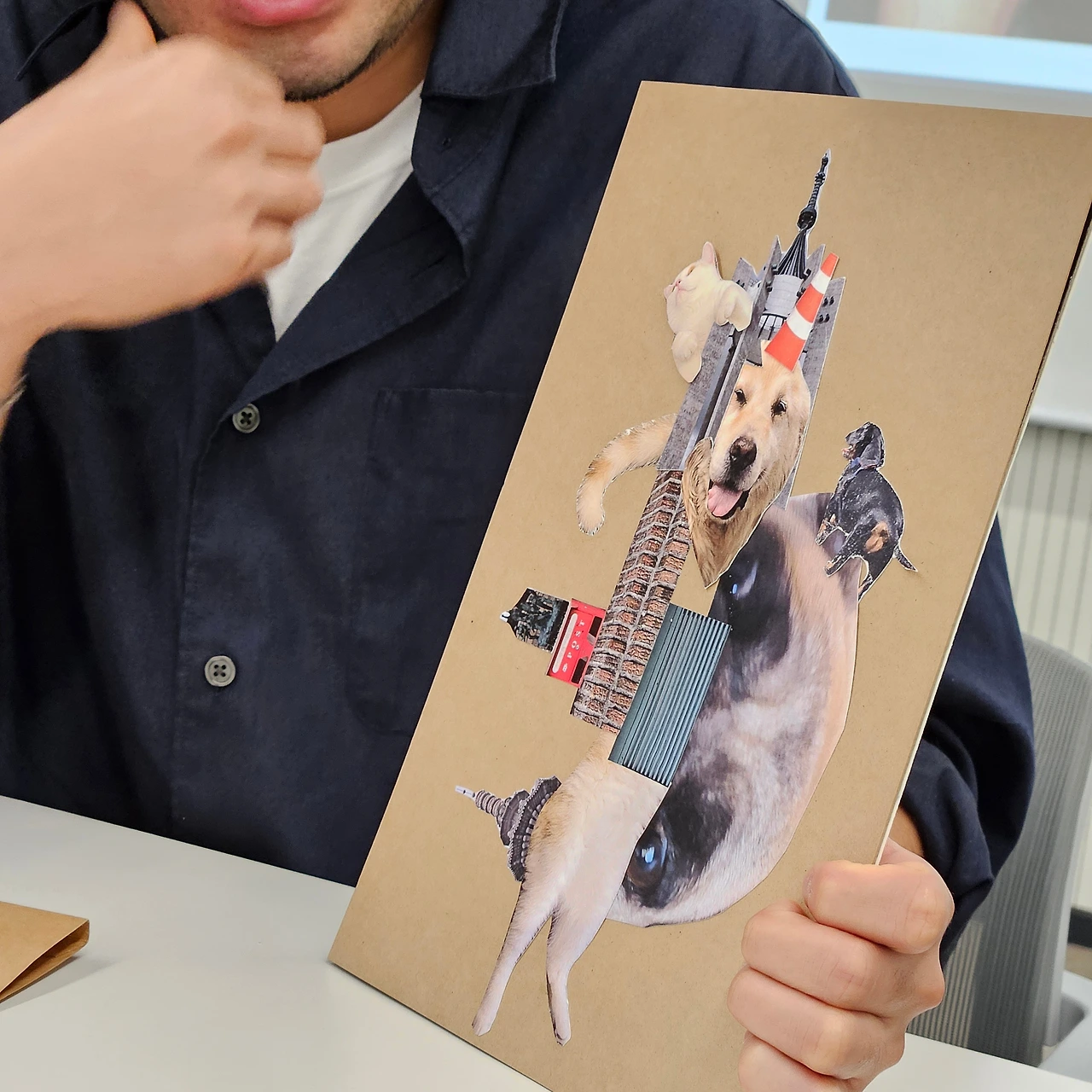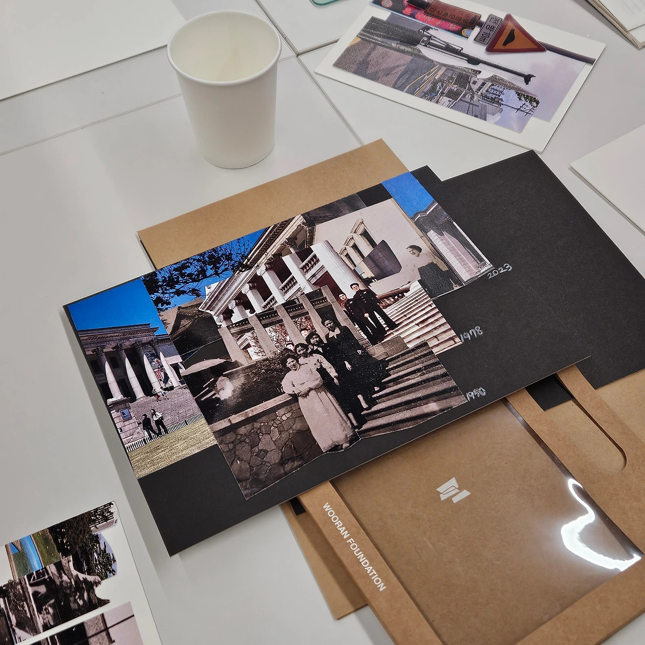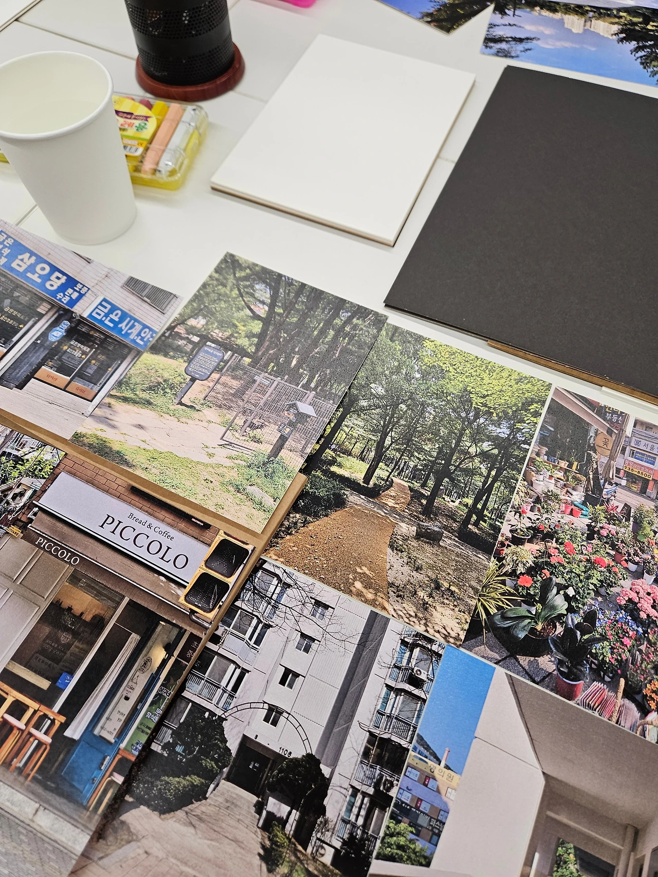 몇 년 전 우란문화재단에서 개최한 <그녀의 자리> 전시에서 도슨트의 설명과 함께 관객 참여형으로 작품을 감상한 경험이 있다. 시각, 청각, 미각 등 다양한 감각으로 기억한 것들은 보다 오랫동안 풍성하게 마음속에 남아있는 것 같다. 그때의 좋은 기억이 남아서인지 이번 <10년이면 강산도 변한다> 전시와 더불어 작가의 워크숍 소식에 기대는 더욱 높아졌다. 내가 참여한 워크숍은 서지우 작가의 <쌓고 쌓은 쌓기>다. 신청서를 제출하고 워크숍에 필요한 동네 사진 제출 요청 메일을 받았다. 핸드폰 앨범에서 깊게 고민하지 않고 사진을 몇 장 골랐다. 메일 내용에 기재된 '평면 콜라주'에 대한 사항을 미처 확인하지 못해 어떤 방식으로 워크숍에 참여하게 될지 구체적으로 예상하지 못했다.