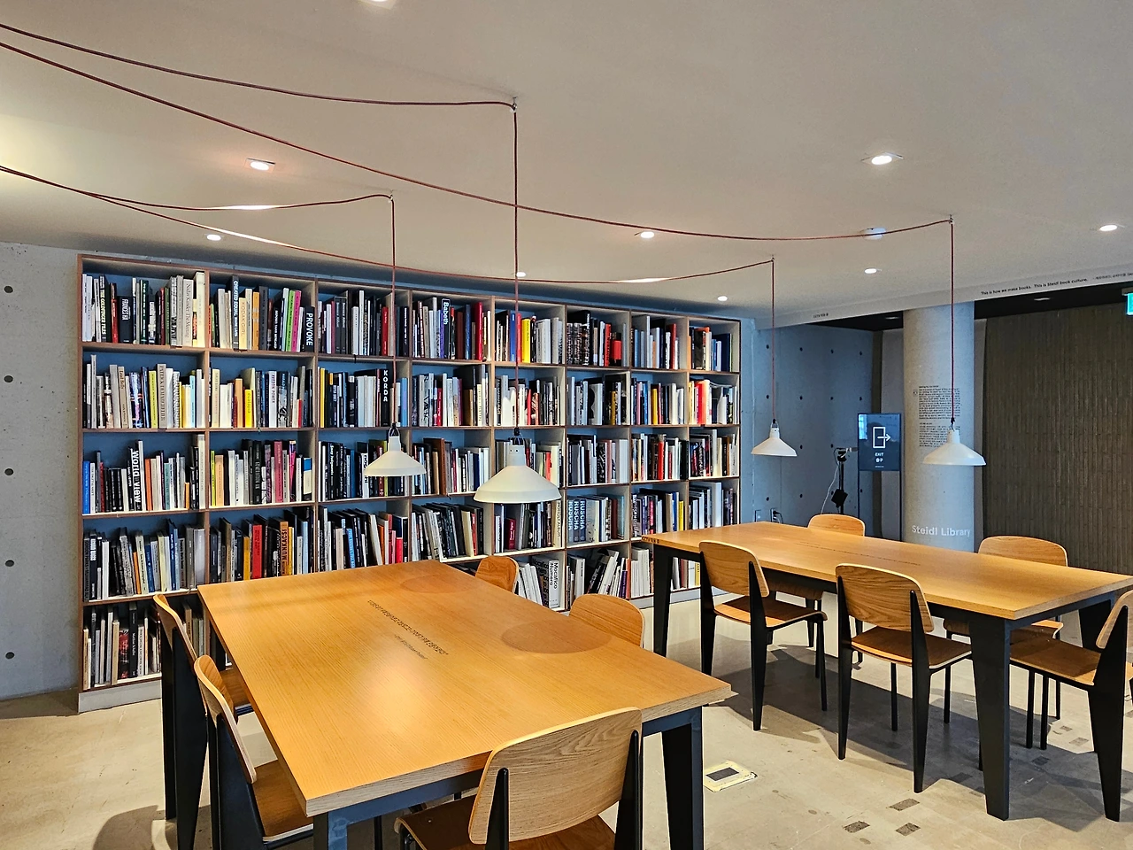 슈타이들의 출판 철학을 직접 체험해볼 수 있는 공간이 전시의 마지막에 마련되어 있었습니다. 바로 '슈타이들 라이브러리'입니다. 이곳의 책상과 의자, 조명까지 실제 독일의 슈타이들빌에 있는 라이브러리를 그대로 재현했다고 합니다. 이 공간에서 추구하는 것 역시 다양한 감각을 통해 책을 감상하는 것입니다. 책의 커버, 종이의 질감, 사진의 배열, 사용된 컬러 등 똑같은 책은 찾아볼 수 없는 이곳은 슈타이들이 만들어낸 그야말로 마법의 책장입니다.
