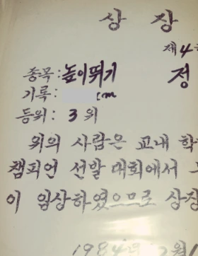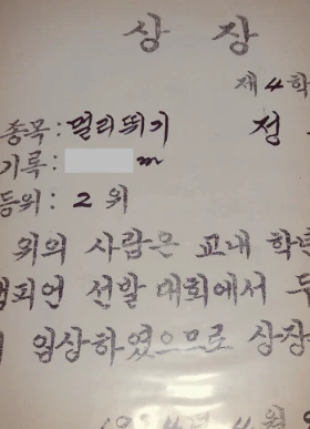 초등학생 때부터 학교, 기관 등에서 받은 모든 서류 등을 모아둔 파일이 있다. 아버지께서는 우리 삼 남매의 상장, 입학 증서, 성적표 등 기억될 만한 자료들을 큰 서류철에 모아 두셨다가 결혼할 때 넘겨주셨다. 아주 가끔 그걸 펼쳐보는데 거기엔 뜬금없는 상장이 두 개 있다.