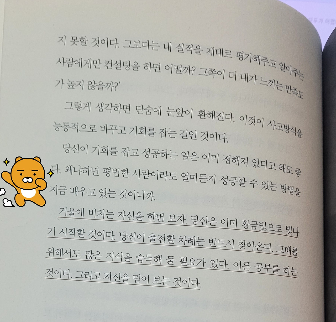 거울에 비치는 자신을 한번 보자. 당신은 이미 황금빛으로 빛나기 시작할 것이다. 당신이 출전할 차례는 반드시 찾아온다. 그때를 위해서도 많은 지식을 습득해 둘 필요가 있다. 어른 공부를 하는 것이다. 그리고 자신을 믿어 보는 것이다.