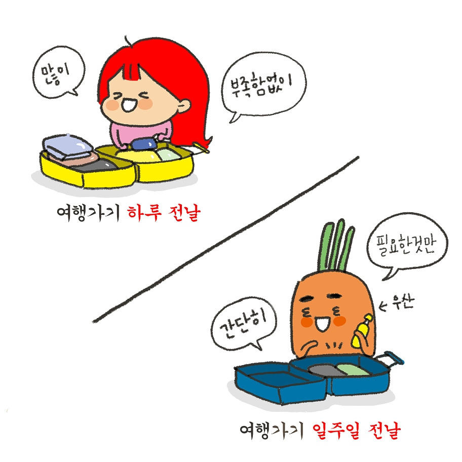 나는 하루를 자고 오더라도 풍성하게 부족함 없이 마구마구 짐을 싸는 반면, 당근이는 필요한 것만 가볍게 짐을 싸는 스타일이었다.