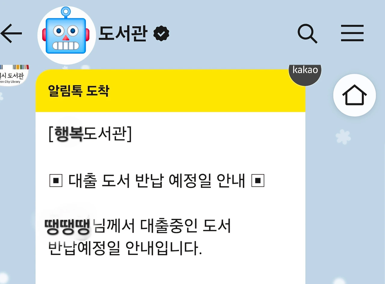 이 안내 메시지는 도서 반납 하루 전 날 칼 같이 카카오톡으로 발송된다. 벼락치기 독서의 방아쇠 역할을 톡톡히 하는 셈이다. 안내 메시지 덕분에 열심히 책도 읽고 반납일도 잘 지킬 수 있으니 무척 고마운 서비스이다. 그나저나 나의 독서 패턴은 시간이 흘러도 발전이 없네 그려.
