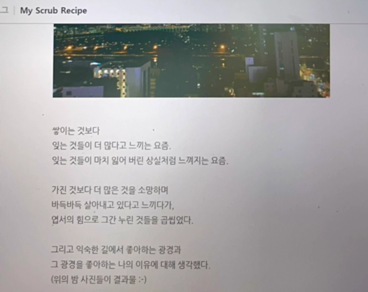 어제도 하루 종일 자고 주말을 맞이했다. 이번 학기는 4일만 수업이 있기도 하고 수업은 반복적으로 했던 것들이라 수업 준비시간이 많이 줄었다. 개인적인 시간이 생겼다. 취미 생활을 하려고 통유리로 된 카페에 왔다가 그만 노래와 경치에 심취해버렸다. 갑자기 감성적인 것들을 좇다가 좋아하는 이웃님 블로그에서 멈췄다. 바디 스크럽을 올리시고 틈틈이 생각을 공유해주시는데 너무 좋다. 언젠가 이런 글을 쓰셨다.