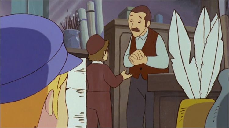 네로는 미술용품을 파는 가게를 지나간다. 가게 안에 쌓여있는 하얀 도화지를 본 네로. 네로는 나무판자와 돌이 아닌 새하얀 도화지에 그림을 그리고 싶다. 도화지 가격은 10 상팀centime(당시 벨기에 화폐 단위). 하루 벌어 하루를 먹고사는 네로 집 형편으로는 조금 버거운 금액. 헤, 하고 입을 벌린 채 도화지를 바라보던 네로 옆으로 멀끔히 차려입은 비슷한 또래 아이가 마차에서 내려 가게 안으로 들어간다.