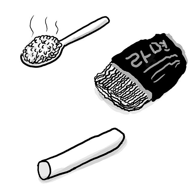 집으로 돌아와 저녁 준비를 하던 이모는 도깨비에 홀린 듯한 표정으로 "밥이 이거밖에 없었나??" 하고 내 쪽을 쳐다보았다. 난 왠지 크게 혼날 것 같다는 생각이 들어 느껴지는 시선을 외면한 채, 아무 말도 못 들은 척 티브이에 시선을 응시했다. 내가 맨밥, 생라면, 가래떡과 같이 밍밍한 맛을 좋아한다는 사실을 이때부터 깨달았고 지금도 가끔 출출할 땐 이런 식의 식사?를 한다.