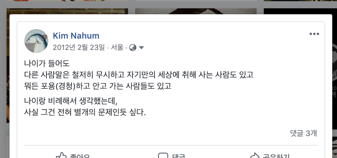 회사가 생김으로 내 형편은 전보다 많이 나아졌다. 첫째로는 경제적으로 안정감을 갖게 된 것이다. 그 덕분에 퇴근하고 나서 좀 더 편안한 마음으로 내 그림 작업에 집중하게 되었다. 두 번째로는 전 날 집에서 작업한 그림을 회사에서 인쇄하여 내 눈으로 실물을 확인할 수 있다는 것이다. 하지만 이런 장점보다도 내 삶에 가장 좋은 영향을 주었던 일은 바로 사장님과의 정서적 정신적 교류였다. 특히 가끔씩 갖게 되는 사장님과의 저녁 술자리는 내게 늘 배움의 장이었고 설레는 일이었다. 평소에는 퇴근하고 집에 돌아가 그림을 그렸지만 가끔 일이 고되거나 사장님이 약속이 없을 때면 “김나훔이 오늘 고생했는데 내가 고기 사줘야지?”라고 말을 건네면서 일종의 데이트 신청을 하셨다. 나는 그 시간이 좋았다. 사장님이 어떻게 지금과 같은 수평적인 사고를 갖게 되었는지, 또 어떻게 이런 넓은 시야로 세상을 바라보게 되었는지 이해할 수 있게 되었다. 죽어가는 노인은 불타는 도서관과도 같다고 했던가. 나는 그 말의 의미를 몸소 체험하게 됐다