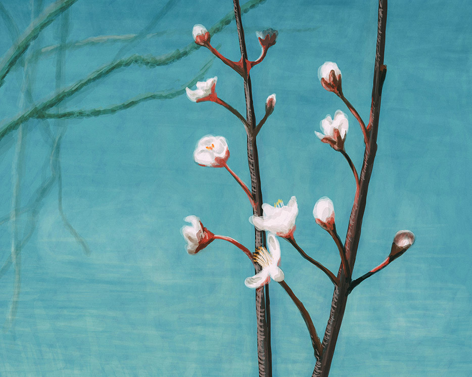 건물 꼭대기 층에는 바람이 거세게 불었다. 그러면서도 동시에 내리쬐는 햇살은 따뜻했다. 천천히 수도원을 걸어 내려오는데 계단 근처에 조금씩 피어나는 살구꽃을 발견했다. 가문 내 마음처럼 세상도 내내 겨울인 줄로만 알았는데 어느새 봄이 다가오고 있었다. 그렇게 따뜻한 계절이 온다는 사실이 큰 위안이 되었다. 피기 전 꽃나무 하나에 이런 깊은 위로를 받을 수 있다니 스스로 놀라웠다. 그 순간의 강렬한 기억을 사진으로 남겨두었다가 나중에 베를린으로 돌아와 그림으로 옮겼다.