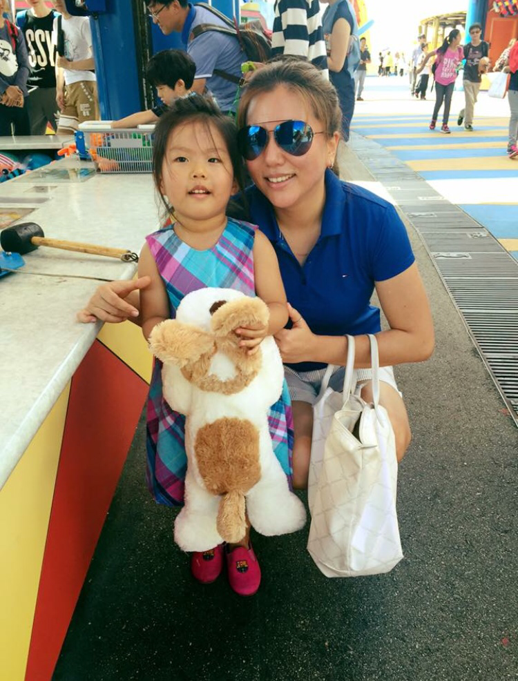 몇 번 휘두르더니 회심의 한 방. 포물선이 심상찮다. 꺄오, 연꽃 안에 개구리 안착. 여전히 건재하다. 미야자키의 우도신궁에서 레이세키카메이시 향해 운다마(運玉) 투척할 때의 그 스킬. 청출어람의 따님은 재간둥이 모친 덕분에 큼직한 인형을 품에 안는다. 억수로 운수 좋은 날!