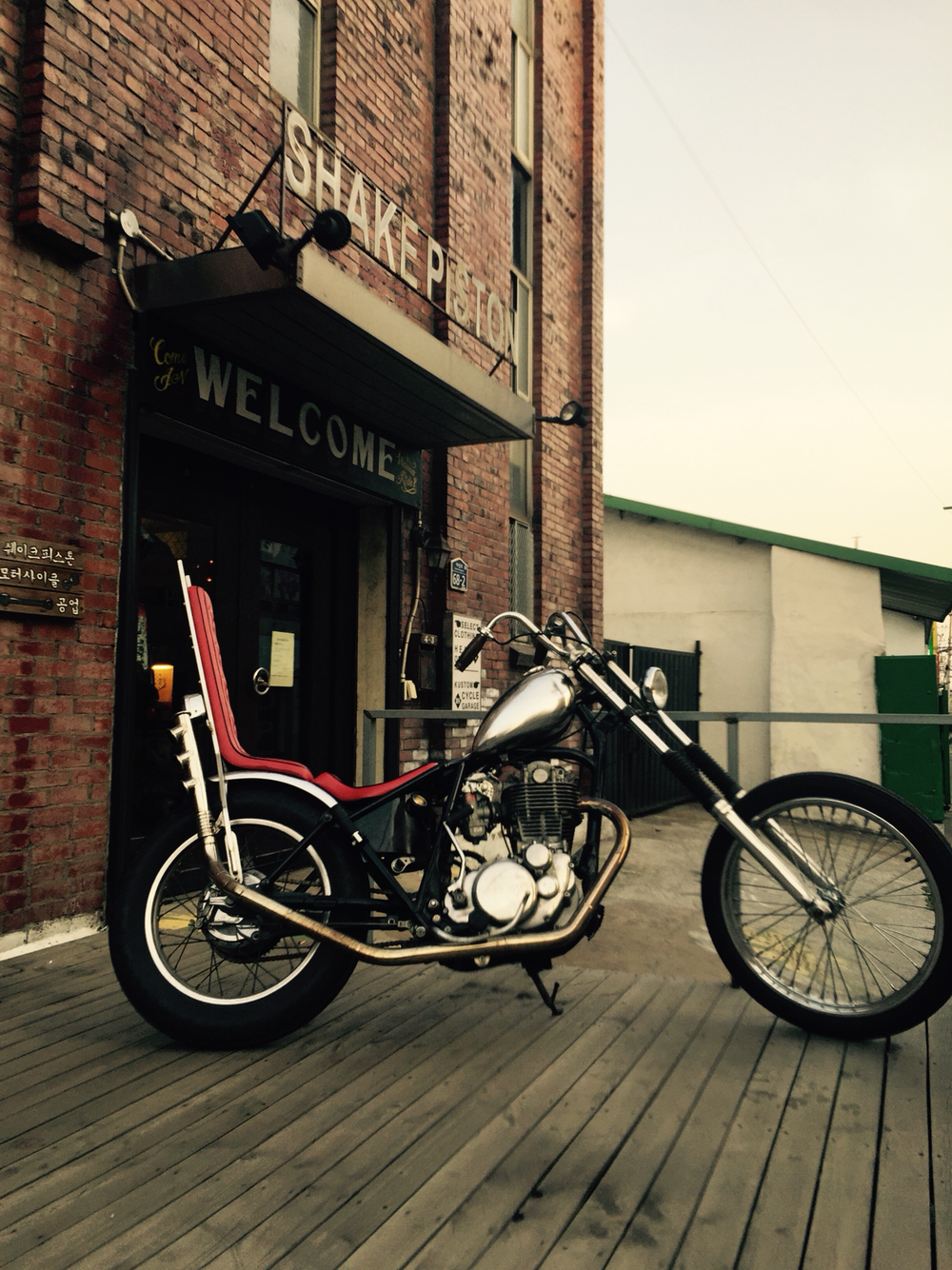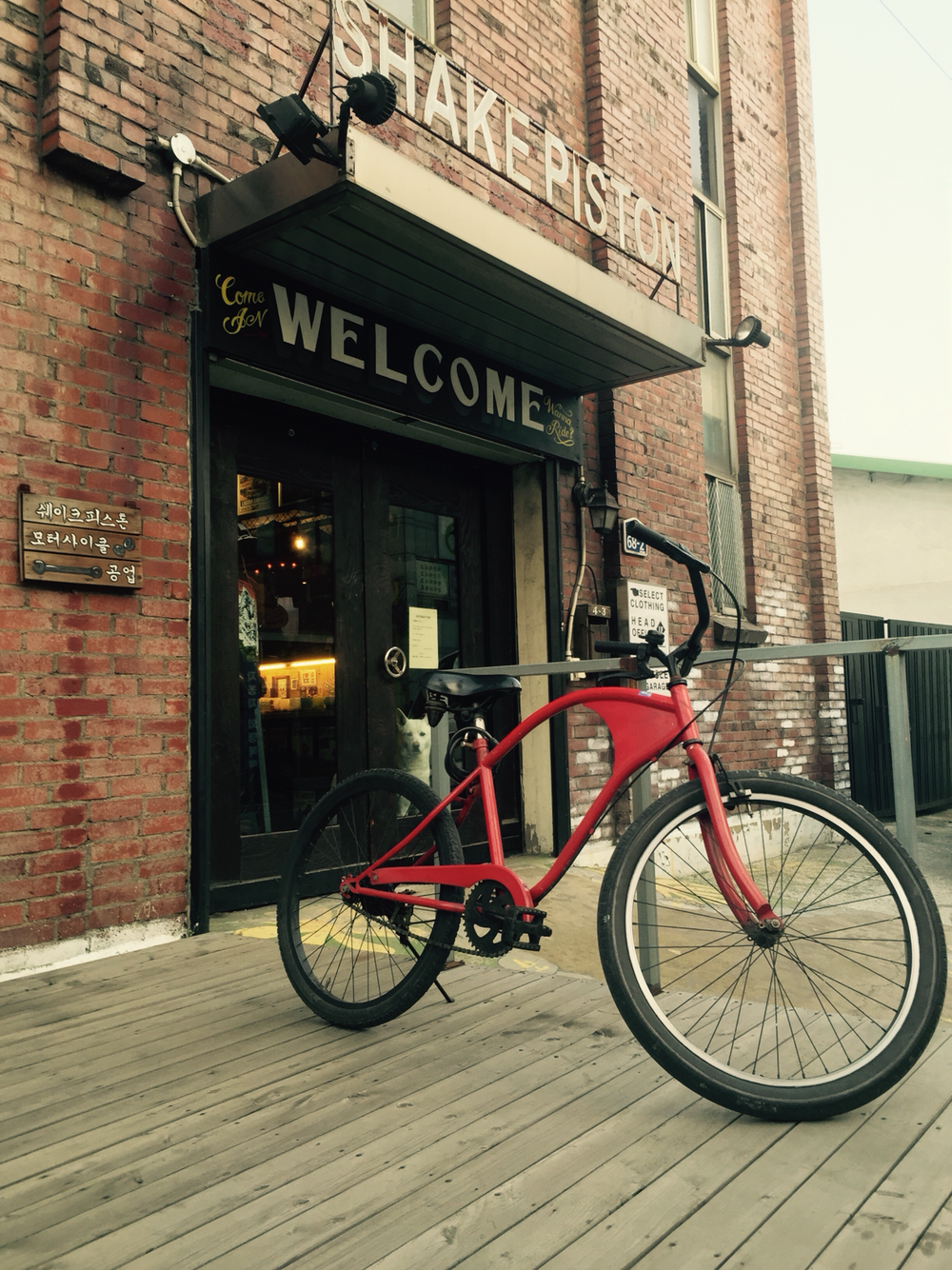 퇴근길. <쉐이크 피스톤>을 지나다 일시정지. 국내에서 손꼽히는 모터사이클 커스텀 빌더의 아지트 앞에 사이클이 놓여 있다. 주인장의 애마인가. 그냥 자전거도 왠지 모르게 감각적이다. 붉게 물든 body는 딱 내 취향.