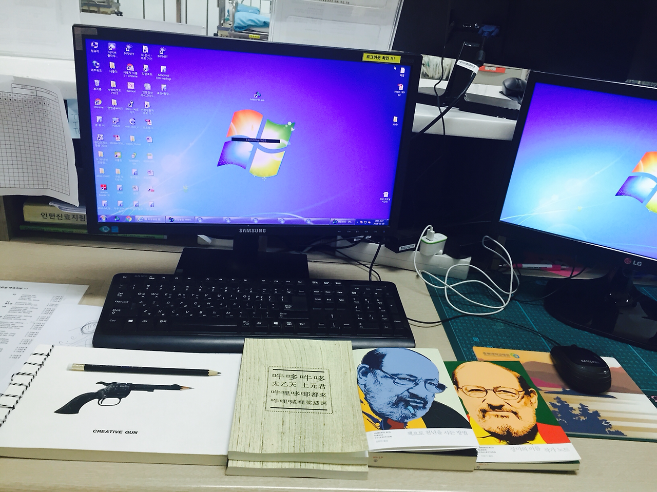 오랜만에 출근. 옷 갈아입으려고 locker 열었는데, 택배 박스가 반긴다. 상자에 담긴 건 움베르토 에코 마니아 컬렉션(책으로 천년을 사는 방법과 장미의 이름 작가 노트)과 CREATIVE GUN, 한 작가님의 대청호 마우스패드와 태을주 노트.
