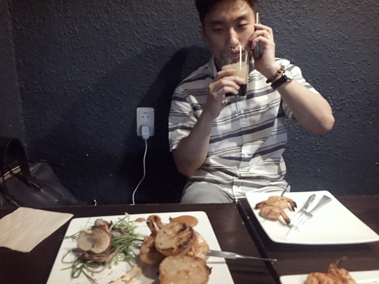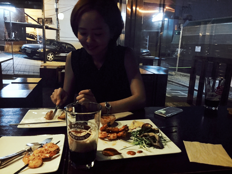 미녀는 즐거워. 윤동주로 대동단결.경리단길 댄디핑크에서 올드라스푸틴에 새우와 양꼬치.고대병원 내과의 강 선생과 뭐든 해내는 워커홀릭 민 작가와 함께.#이태원 #경리단길 #댄디핑크#올드라스푸틴에_댄디핑크_사장님_얼굴이
