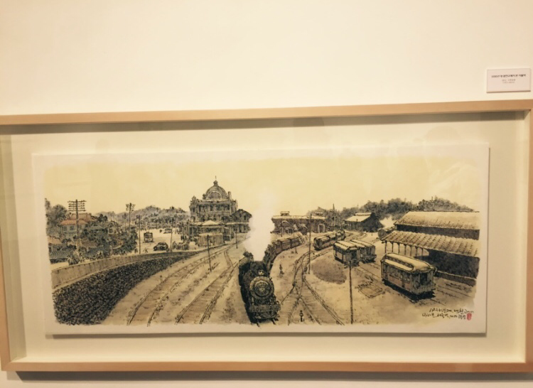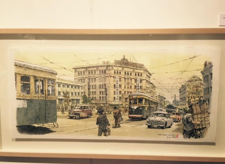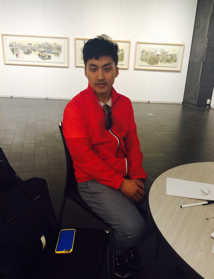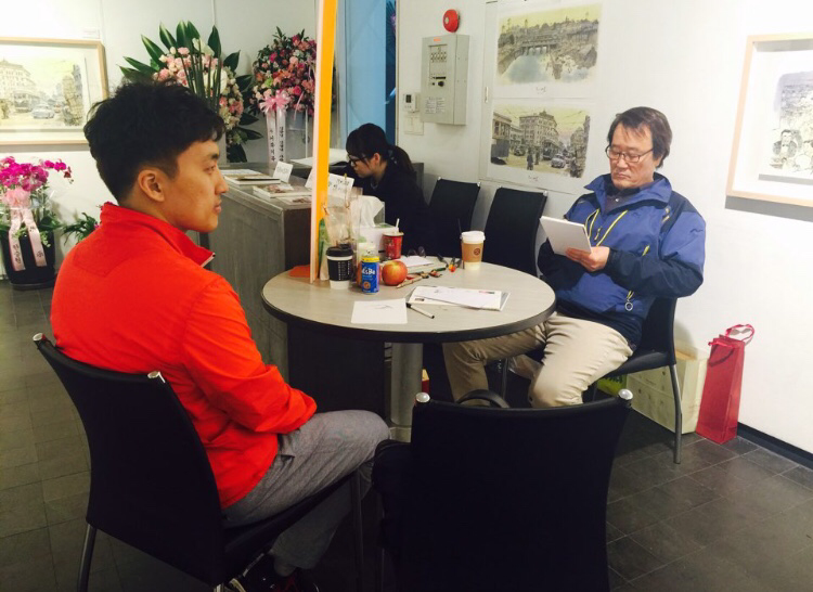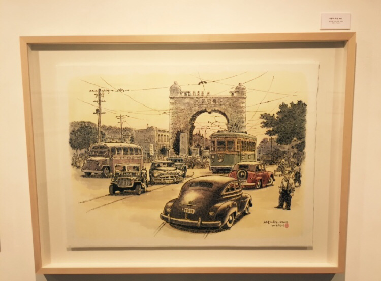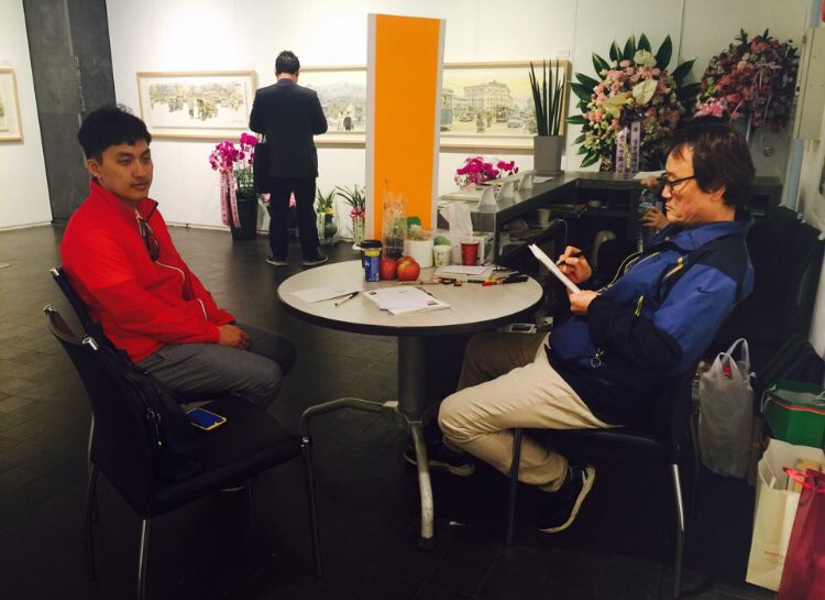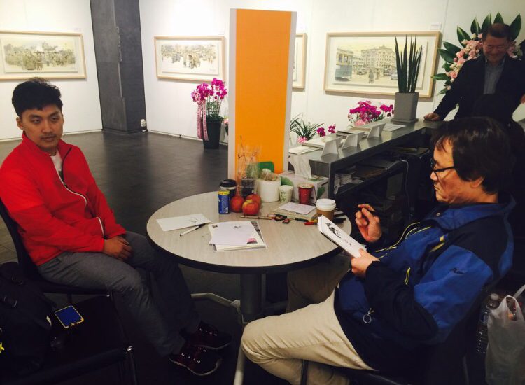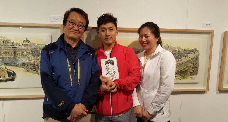 수묵水墨과 담채淡彩로 되살아났다.오래 전 서울 풍경.김광성 화백께서 초상화를 그려주신다.도록을 산 이들에게 베푸시는 서비스다.미처 몰랐다.모델 노릇 힘들구나.