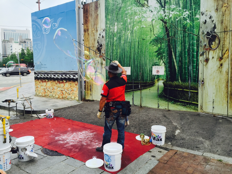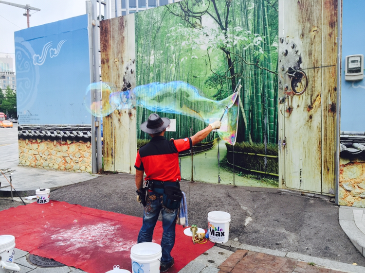 풍문여고 앞. 카우보이 모자 아저씨가 밧줄 달린 채를 쥐고 있다. 교수형 집행할 때 쓸 법한 밧줄이다. 그걸 하얀 통에 잠시 담궜다가 꺼내서 휘두른다. 비눗방울이 촤르르. 우와, 초대형이다. 바람결대로 출렁인다. 용처럼 꿈틀댄다.