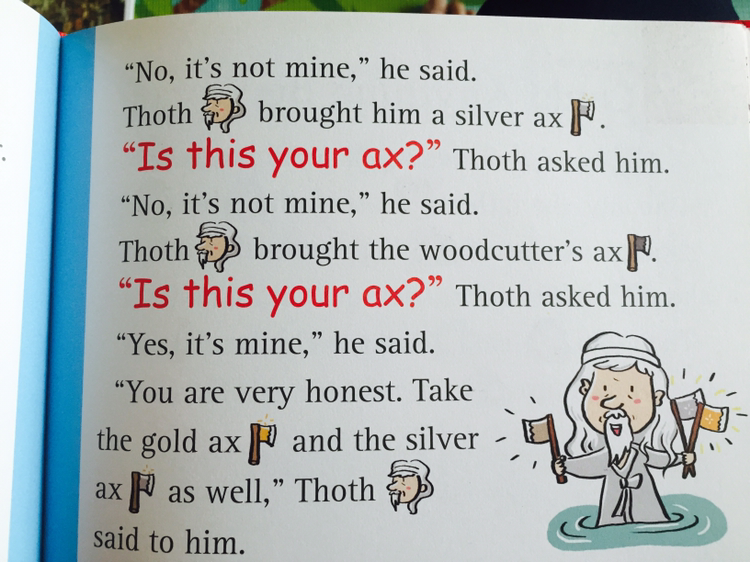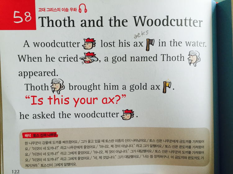 "아빠, 나 봐봐~" 쪼르르 책을 가져온다. 읽어달란 얘기다. 어쩜, 영어 동화네. 딱 펼치니, 금도끼 은도끼 이야기. 적힌 대로 읊어줬다. 잠자코 듣더니, 썰을 푼다. "그러니까 욕심쟁이 나뭇꾼이 거짓말을 했어. 그러다가 코가 길어졌어. 피노키오처럼 이렇게. 그치?"