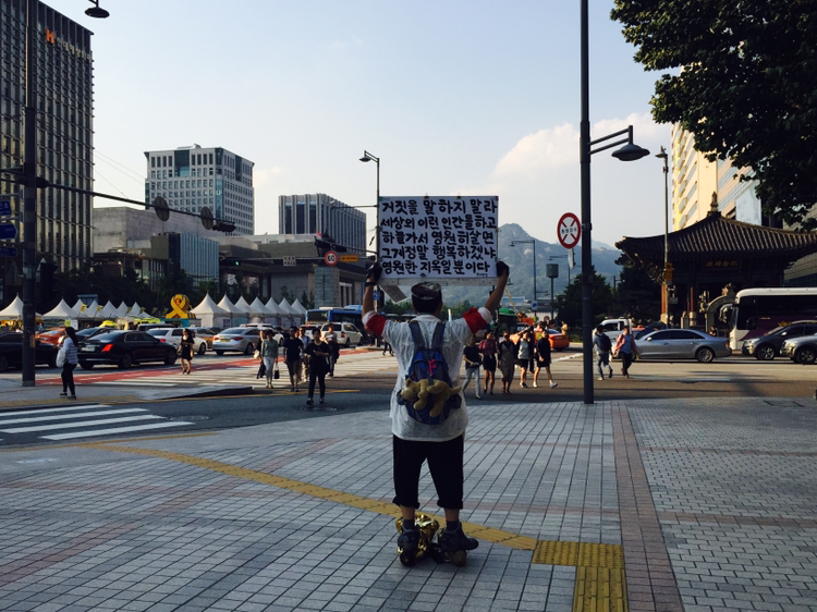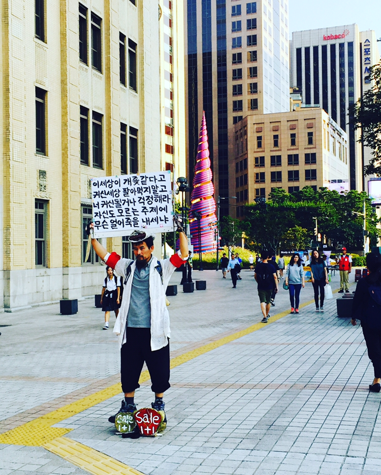 허름한 행색의 아저씨가 피켓을 들고 있다. '귀신 세상 팔아먹지 말고 너 귀신 될 거나 걱정해라.' 내세를 인질 삼아 현세를 협박하는 종교 장사꾼 향한 일갈인가. 격하게 공감한다. 평소의 내 소신과 정확히 일치한다.