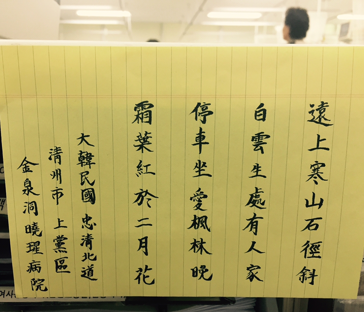 환자 살피러 ER 들르신 신경외과 김 과장님. 붓펜으로 뭔가 끼적이신다. 뭐 하나에 빠지면 끝장을 보시는 분이다. 사진, 모형 비행기, 레고 블록 등. 요즘엔 등산에 꽂히셨다. 그래서 그런가. 메모지에 남기신 한시도 두목杜牧의 '산행山行'이다.