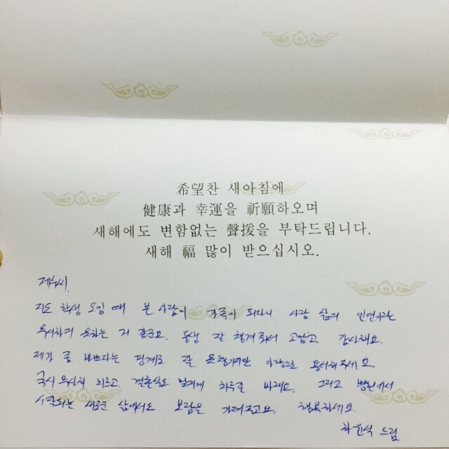 아, 이게 언제냐. 김 원장이 국시와 결혼식 앞둔 시점이니, 2011년 1월이겠네. 천재적 필체의 신년 카드에 하 교수님의 잔정이 잔뜩 묻어 있다. 서재 정리 안 했으면 못 누렸을 즐거움이다. 남들은 의사고시 준비에 매진하는데, 결혼식과 신혼여행 준비에 열과 성을 다하던 의대생 김씨의 자태가 눈에 선하다.