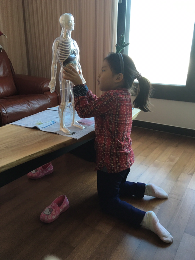 "해골씨 얼른 까줘." 유치원에서 돌아온 하조안, 어제 토이저러스에서 사온 아나토미 키트부터 찾는다. 포장지 뜯어서 안겨줬더니 신나서 외친다. "나 동생 생겼다. 얘 이름은 하준이고, 얘도 나처럼 소양인이야." #토이저러스 #아나토미_키트#그러니까_남동생을_바라는구만