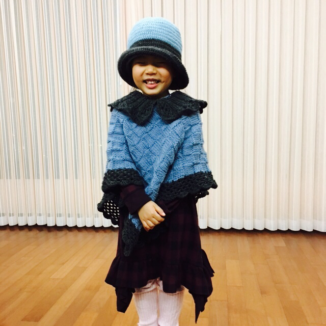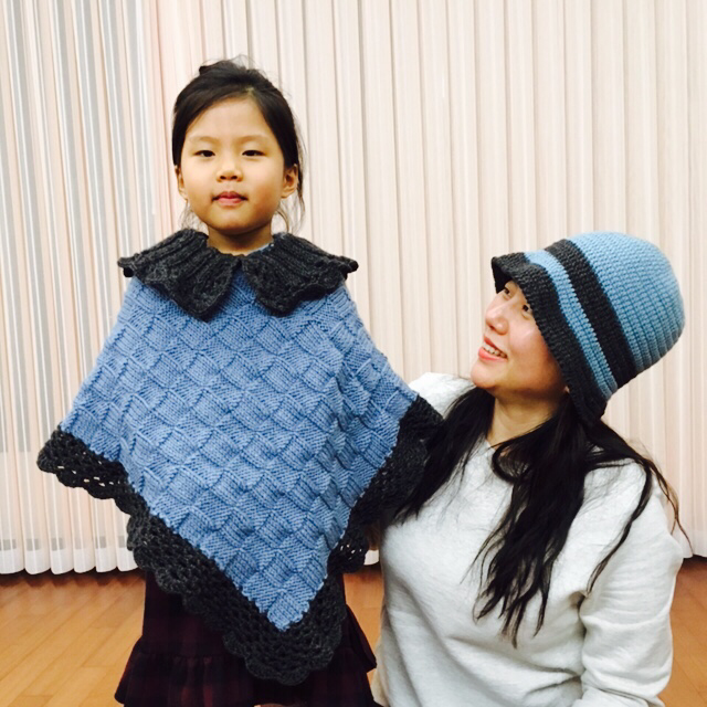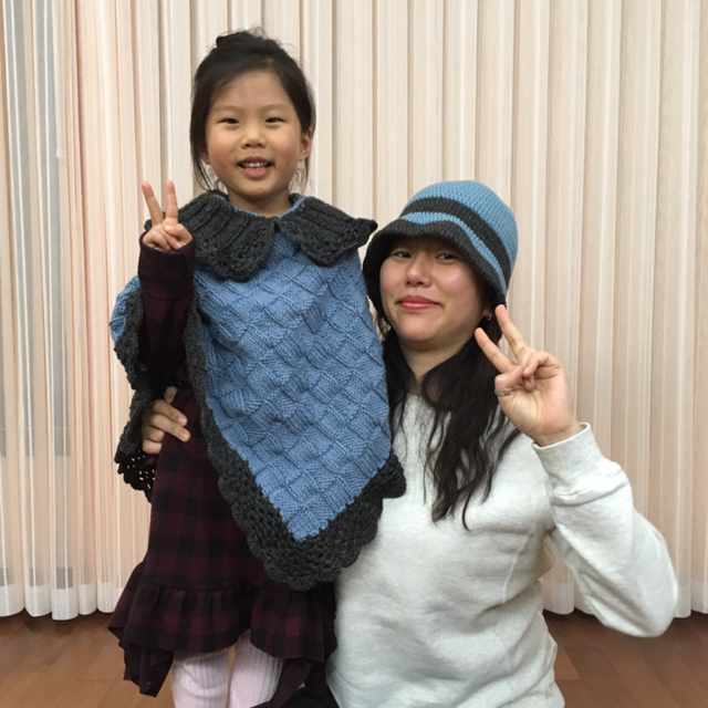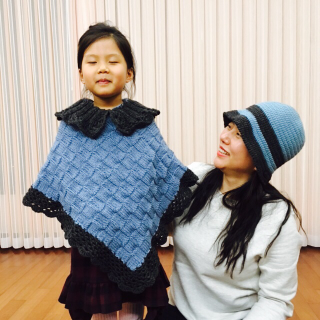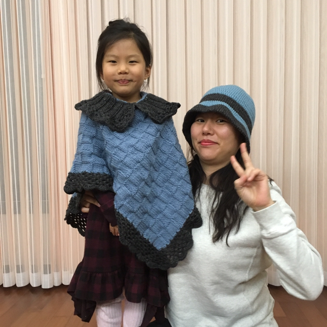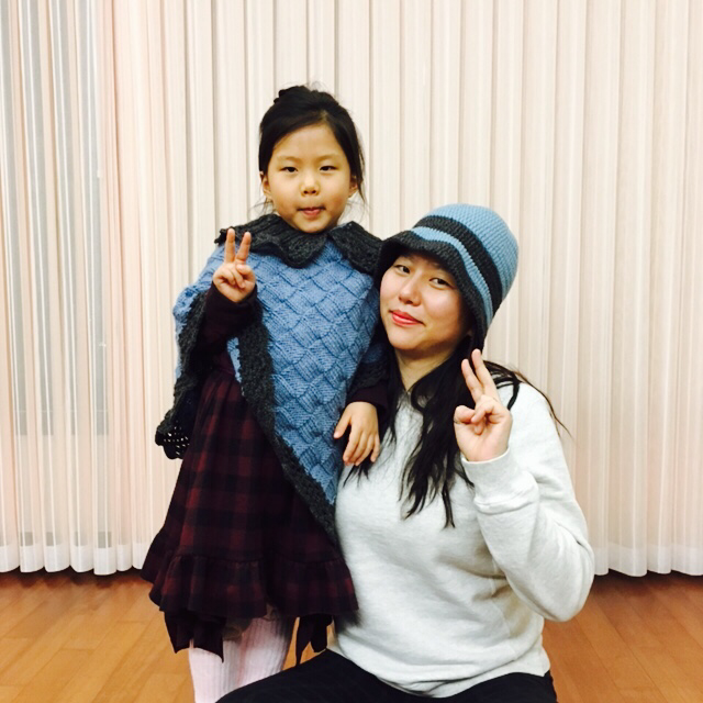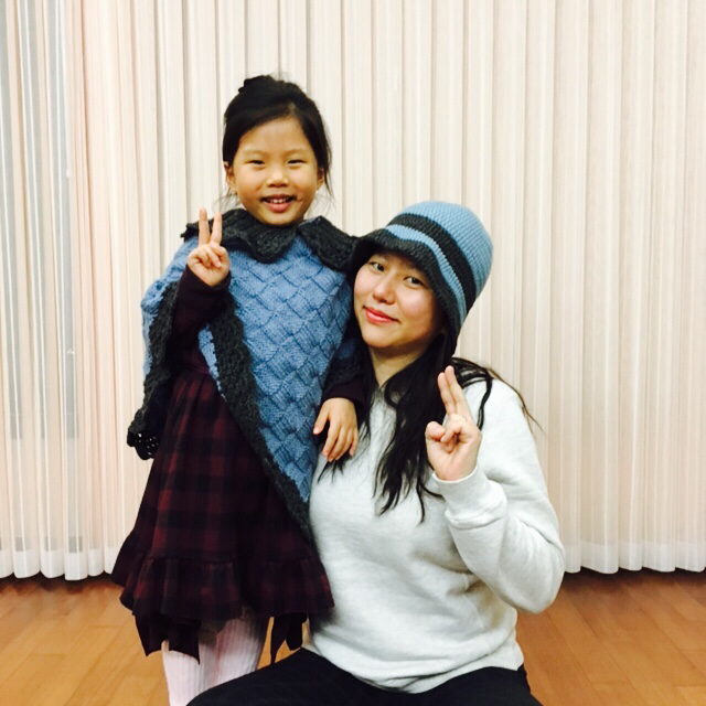 푸르른 망토와 모자가 모녀를 빛낸다. 박재동 화백의 부인이신 김선화 선생님께서 손수 짜서 보내주셨다. 세심한 온정 덕분에 일상이 눈부시다. 받은 만큼, 두루 뿌리리.