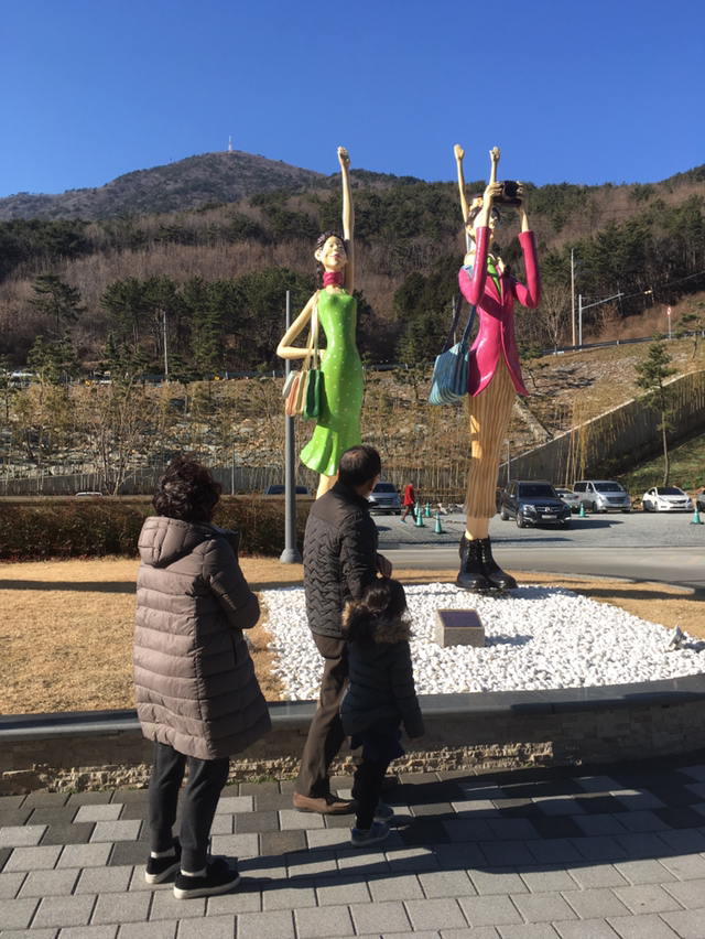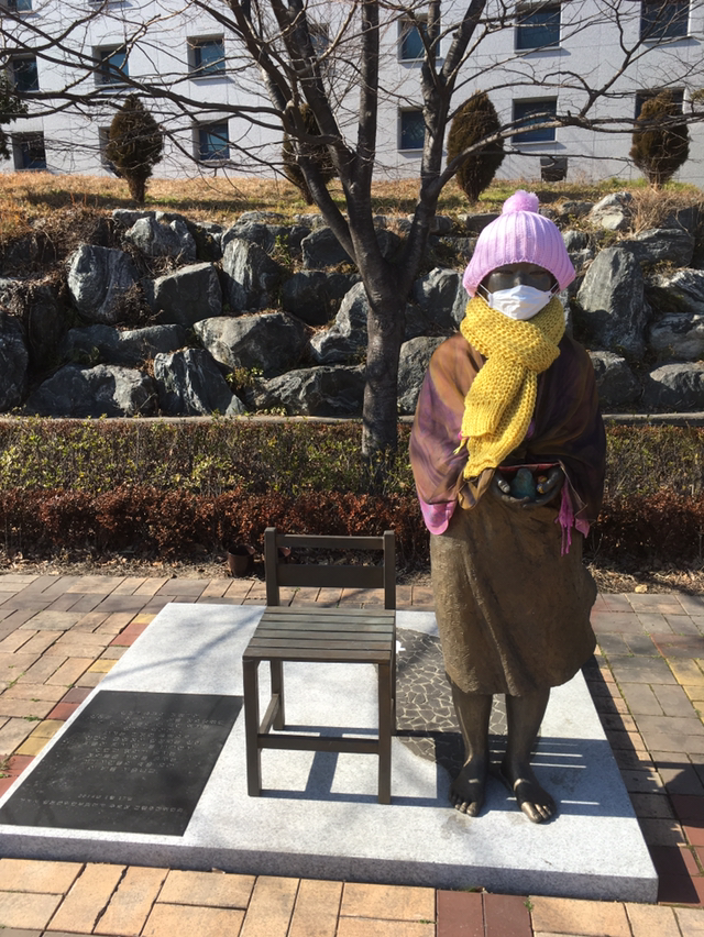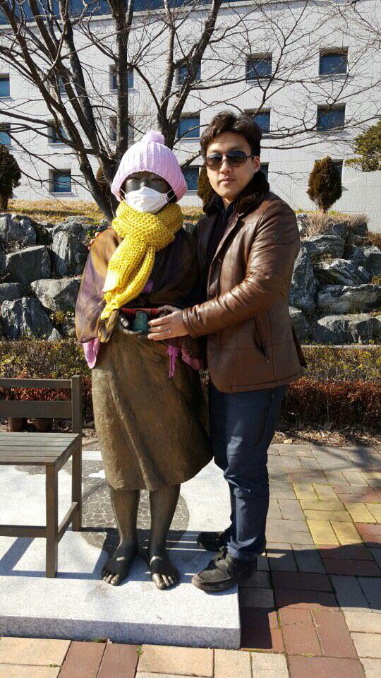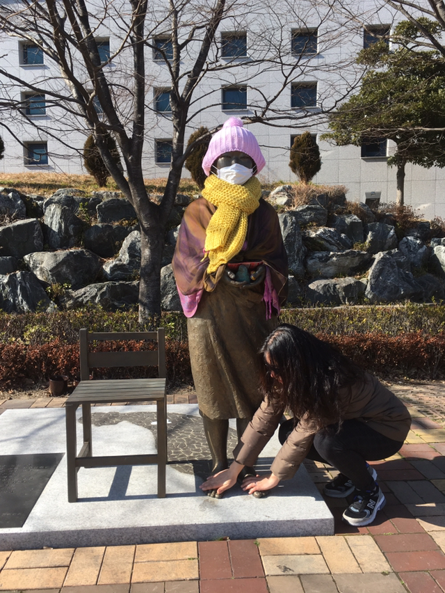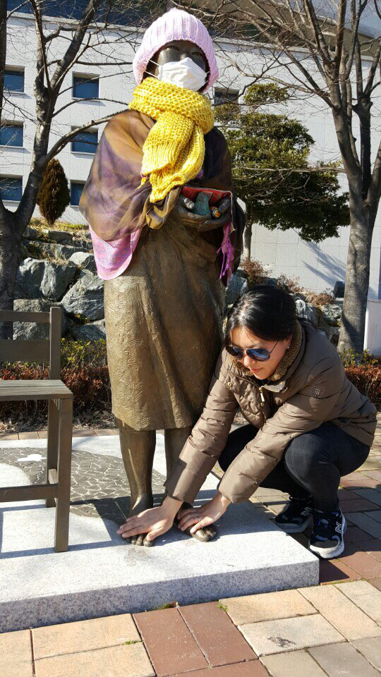 2. 거제문화예술회관의 위안부 소녀상과도 교감. 추워 보여 따스하게 감싸줬다. 나는 손을, 김 원장은 발을 맡았다.
