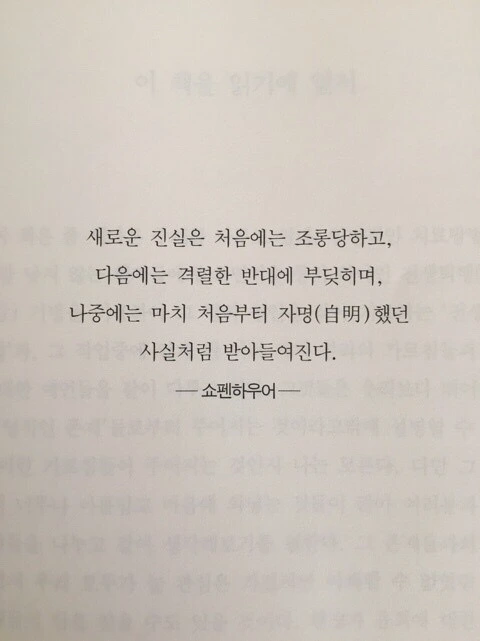'새로운 진실은 처음에는 조롱당하고, 다음에는 격렬한 반대에 부딪히며, 나중에는 마치 처음부터 자명했던 사실처럼 받아들여진다.'쇼펜하우어가 남긴 썰들 중 요즘 자주 곱씹는 말이다. 조롱과 반대를 넘고 넘어, 앞으로 앞으로~ 처음부터 자명했던 사실로 받아들여질 때까지 내가 목도한 새로운 진실을 줄기차게 선포하리라.